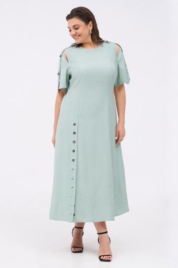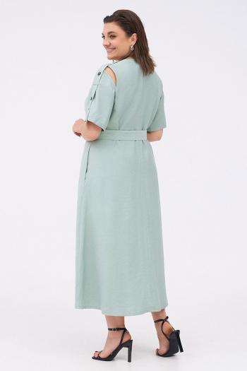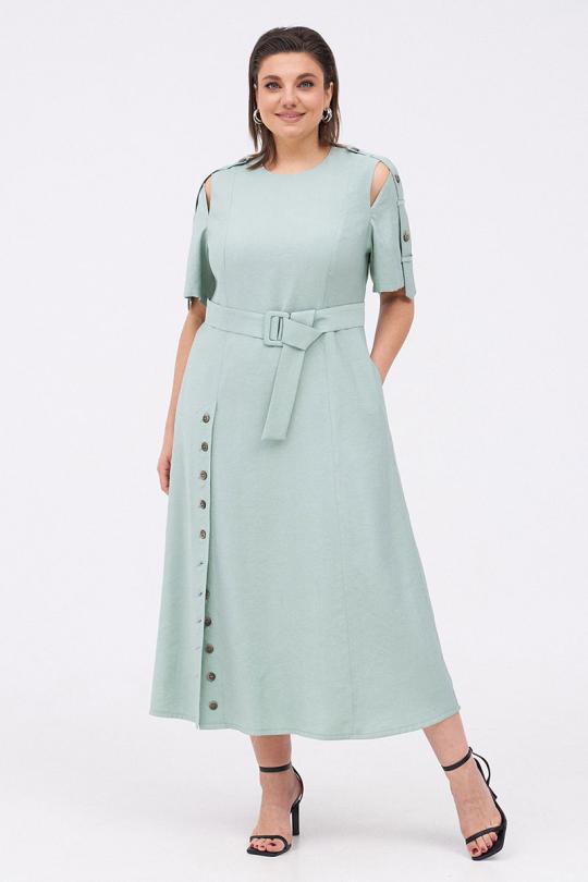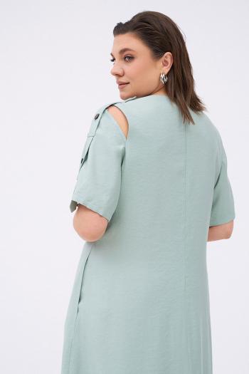 Силуэтное платье с разрезами на плечах и декоративными патами на рукавах. По переду два рельефа, проходящих через центр груди. По низу рельефа справа шлица с регулируемой длиной разреза за счёт застёжки на пуговицы. Платье застёгивается на потайную молнию на спинке. Комплектуется текстильным ремнём.