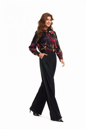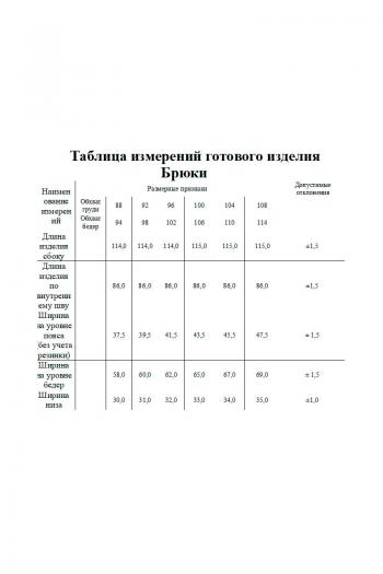 Брюки женские большого объема, прямого силуэта, вида «палаццо». На передних половинках брюк по линии талии заложены две односторонние складки, направленные в сторону бокового шва и функциональные карманы с отрезным бочком. На задних половинках находятся по две талиевые вытачки. Пояс отрезной, притачной, с уступом на правой передней половинке. На поясе шлевки. Верхний край пояса расположен на естественной линии талии. Застежка брюк – классический гульфик. Застежка пояса на две пуговицы и две петли. Длина брюк в пол.
