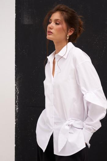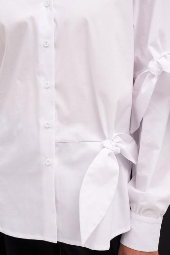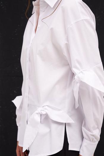 Рубашка свободного силуэта со спущенной линией плеча, классическим воротником на стойке и с застёжкой на планку с пуговицами. По переду и рукавам декоративные элементы в виде завязок. Спинка слегка длиннее переда. По бокам разрезы.
