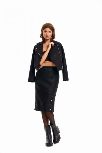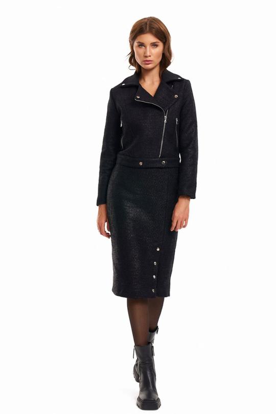 Стильный 2-предметный комплект, состоящий из жакета и юбки. Жакет-косуха женская со смещенной застежкой на молнию, на подкладке. Перед с вертикальными рельефами и косыми прорезными карманами «в рамку» на молнии. Спинка с вертикальными рельефами. Рукав втачной двухшовный до линии запястья. Воротник стояче-отложной на отрезной стойке. Куртка длиной до середины бедра. По низу притачной пояс, который застегивается на 2 кнопки. В углах воротника расположены декоративные кнопки. Юбка умеренного объема, прямого силуэта, слегка зауженная книзу. Юбка без пояса, на обтачке. На переднем и заднем полотнищах юбки талиевые вытачки. На переднем полотнище с правой стороны рельеф, переходящий в шлицу. На верхней части шлицы расположены 4 кнопки: первая функциональная, остальные декоративные. На заднем полотнище средний шов с застежкой на потайную молнию. Юбка на притачной подкладке длинной ниже линии колена.