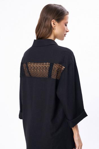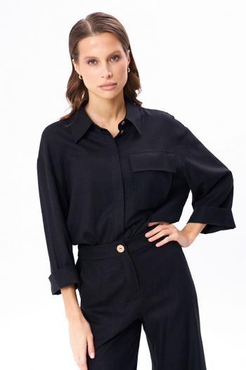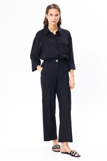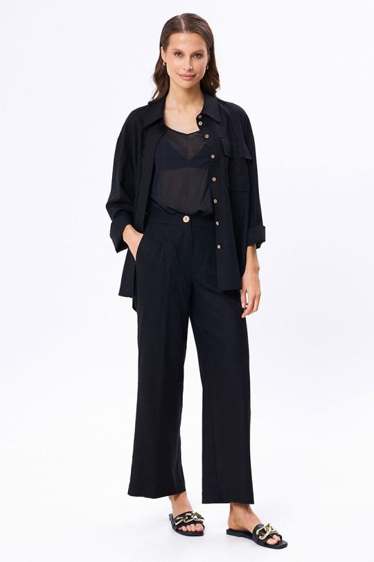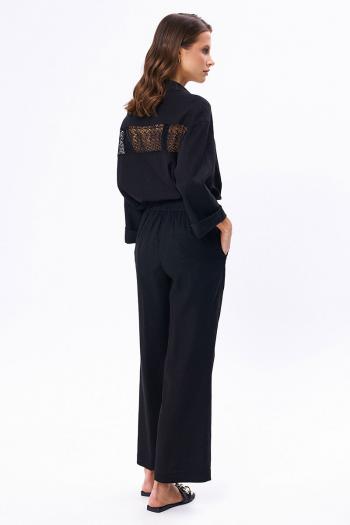Льняной комплект, состоящий из объёмной рубашки и прямых брюк. Рубашка со спущенной линией плеча. Рукав длиной 7/8 с широкой подгибкой. По переду накладной карман с клапаном. По спинке вставка из полупрозрачного кружева. По бокам разрезы. Брюки на резинке по поясу спинки. Застёжка на гульфик с молнией и пуговицу. По бокам карманы.