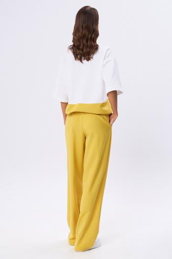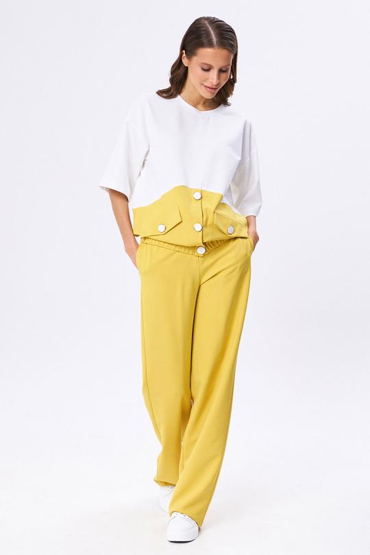 Прямые брюки из костюмной ткани частично на резинке по поясу с застёжкой на гульфик с молнией и пуговицу. По бокам карманы.