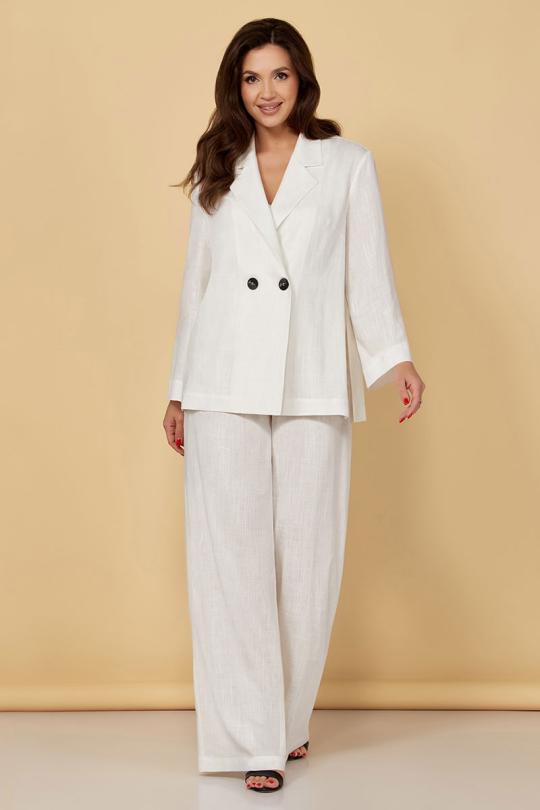 2-предметный костюм, состоящий из жакета и брюк. Двубортный жакет прямого силуэта без подкладки со спущенной линией плеча и застёжкой на пуговицы. По бокам разрезы. Брюки-палаццо прямого силуэта. На передних половинках брюк по линии талии заложены две односторонние складки, направленные в сторону бокового шва и функциональные карманы с отрезным бочком. На задних половинках находятся по две талиевые вытачки. Пояс отрезной, притачной. На поясе шлевки. Верхний край пояса расположен на естественной линии талии. Застежка брюк – классический гульфик. Застежка пояса на две пуговицы и две петли. Длина брюк в пол. Комментарии к товару