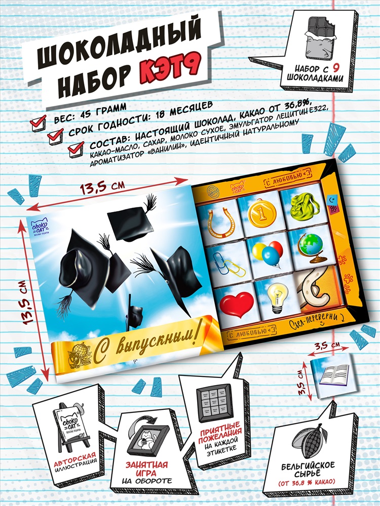 Самая продаваемая серия. Набор с 9 молочными шоколадками, где каждая плитка завёрнута в красочную этикетку со своим индивидуальным дизайном и приятным посланием. Формат позволяет уместить больше продукции на полку. На обороте коробочки увлекательная игра.