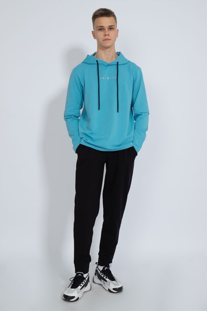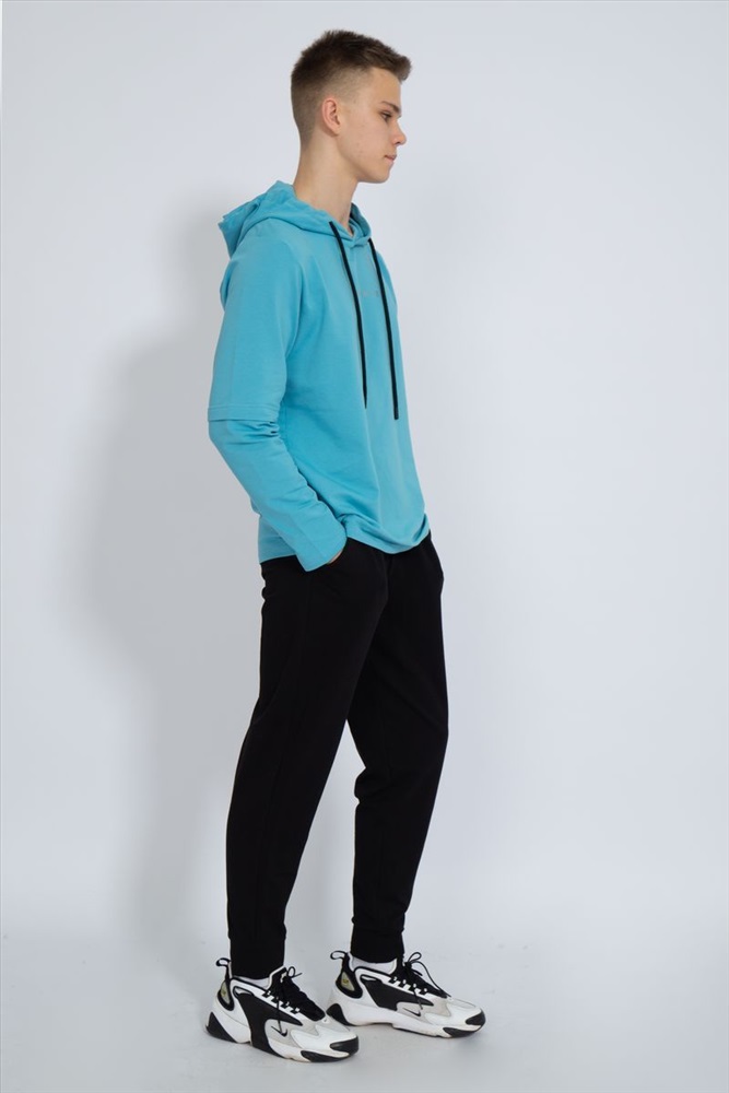 Костюм мужской BALANCE. Лонгслив с капюшоном. Брюки средней посадки зауженные к низу с карманами в боковых швах. Обработка низа брюк манжета. Подойдет тем кто любит максимально натуральные ткани. В составе 95% хлопка и 5% эластана. Хлопок обеспечивает комфорт, а эластан отвечает за внешний вид костюма. Ткань - футер 2-х ниточный плотность 245 г.м2. Изнанка на натуральной хлопковой основе.