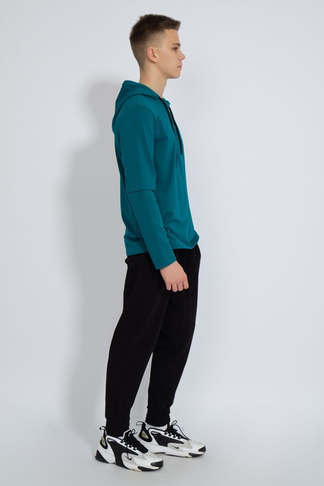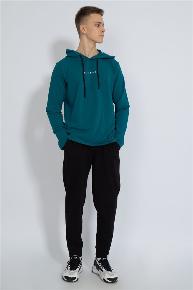Костюм мужской BALANCE. Лонгслив с капюшоном. Брюки средней посадки зауженные к низу с карманами в боковых швах. Обработка низа брюк манжета. Подойдет тем кто любит максимально натуральные ткани. В составе 95% хлопка и 5% эластана. Хлопок обеспечивает комфорт, а эластан отвечает за внешний вид костюма. Ткань - футер 2-х ниточный плотность 245 г.м2. Изнанка на натуральной хлопковой основе.