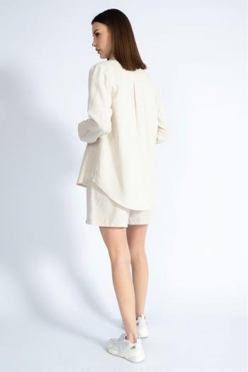Рубашка лен полуприлегающего силуэта с втачными рукавами, удлиненная по спинке. Обработка низа рубашки в форме овала.