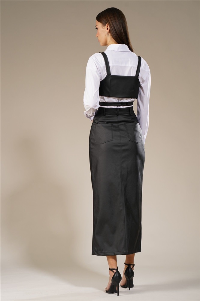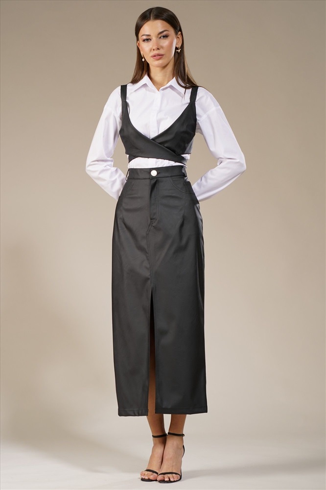 Страна производитель: Республика Беларусь Комплектация: Юбка, Топ Сезон: Демисезон Коллекция: Осень-Зима, Осень 2023 Стиль: Деловой, На каждый день Цвет: черный Материал: экокожа Состав: 50% полиуретан, 50% полиэстер Рост: 164 см Описание: Костюм состоящий из топа и удлиненной юбки средней посадки. Топ выполнен из качественной искусственной кожи, которая имитирует натуральную кожу, но при этом более дешевая, легкая и удобная в уходе. Топ имеет подкладку, которая обеспечивает комфорт. Юбка имеет среднюю посадку, которая подчеркивает талию и не сковывает движения. Разрез по переду придает юбке сексуальность и позволяет показать ножки. Комментарии к товару