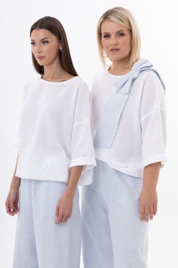 Джемпер: Свободный силуэт с круглым вырезом и съемным бантом в комплекте позволяет легко менять образ — от строгого минимализма до романтичного акцента. Мягкая ткань из льна и вискозы не сковывает движений, а разнообразные оттенки делают его универсальной основой для капсульного гардероба.