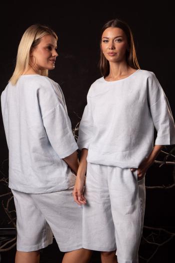 Свободный крой джемпера с круглым вырезом и слегка удлиненной линией подола гарантирует универсальность. Его можно сочетать с брюками, шортами, юбками или носить как платье с поясом. Натуральная текстура льна с добавлением вискозы делает ткань гипоаллергенной и дышащей.