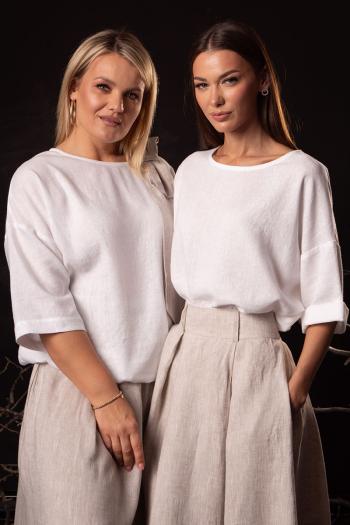 Свободный крой джемпера с круглым вырезом и слегка удлиненной линией подола гарантирует универсальность. Его можно сочетать с брюками, шортами, юбками или носить как платье с поясом. Натуральная текстура льна с добавлением вискозы делает ткань гипоаллергенной и дышащей.