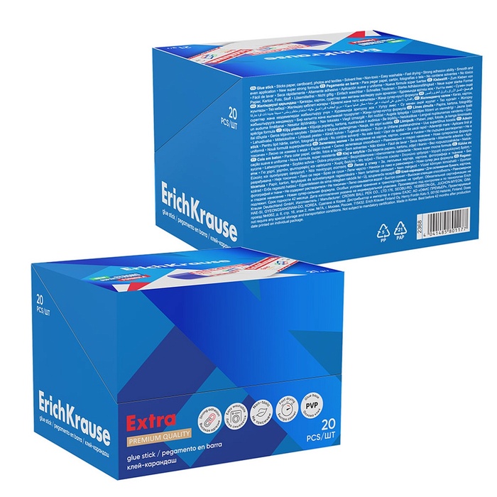 Производитель: ErichKrause; Габариты: 12 x 3 x 3; Доставка: Платная; Артикул поставщика: 2368; Страна: Китай; В боксе: 480 шт; Состав: Клей, пластик; Материалы: клей, пластик; Фасовка: по 20 шт; Индивидуальная упаковка: Без упаковки; Габариты товара: 12 см × 2 см × 2 см; Сертификат: Не подлежит сертификации; Набор: Нет; Европодвес: Да; Вес, г: 21; Назначение клея: Для бумаги; Основа клея: PVP (ПВП); Штрихкод на единице товара: Да; Температурное ограничение транспортировки: Нет; Фиксированная цена: Да Клей-карандаш Extra c новой суперсильной формулой на PVP основе с экономичным расходом, максимально быстрым и надежным склеиванием. Особенности: * Легко смывается водой. * Не токсичен. * Не содержит растворителя. * Морозостоек. * Подходит для бумаги, картона и ткани. Комментарии к товару