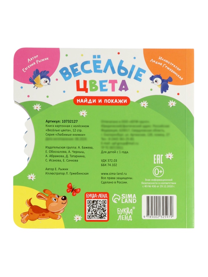 Производитель: БУКВА-ЛЕНД; Габариты: 17 x 0,6 x 17,5; Страна: Россия; В боксе: 60 шт; Состав: Картон; Материалы: картон; Фасовка: по 1 шт; Индивидуальная упаковка: Без упаковки; Сертификат: ЕАС; Набор: Нет; Формат: Квадрат; Возраст: От 1 года; Количество страниц: 12; Год издания: 2024; Тема обучения: Развитие моторики, Цвета, формы, звуки; Тип: С колёсиком, Книжка-картонка; Язык издания: Русский; Тип обложки: Твёрдый переплёт; Автор: Рыжик Евгения Александровна