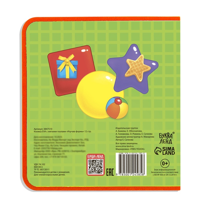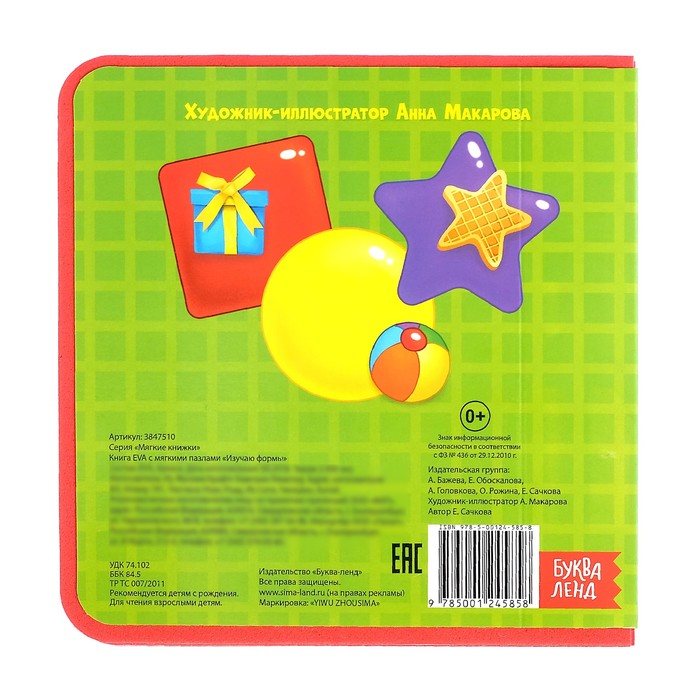 Производитель: БУКВА-ЛЕНД; Габариты: 16 x 3 x 16; Страна: Китай; В боксе: 90 шт; Состав: EVA, картон; Материалы: EVA, картон; Фасовка: по 1 шт; Индивидуальная упаковка: Пакет; Габариты товара: 16 см × 3 см × 15,5 см; Сертификат: ЕАС; Набор: Нет; Возраст: От 0 месяцев; Количество страниц: 12; Развитие навыков: Моторика, Фигуры, цвета; Тип: С пазлами; Автор: Сачкова Евгения Камилевна