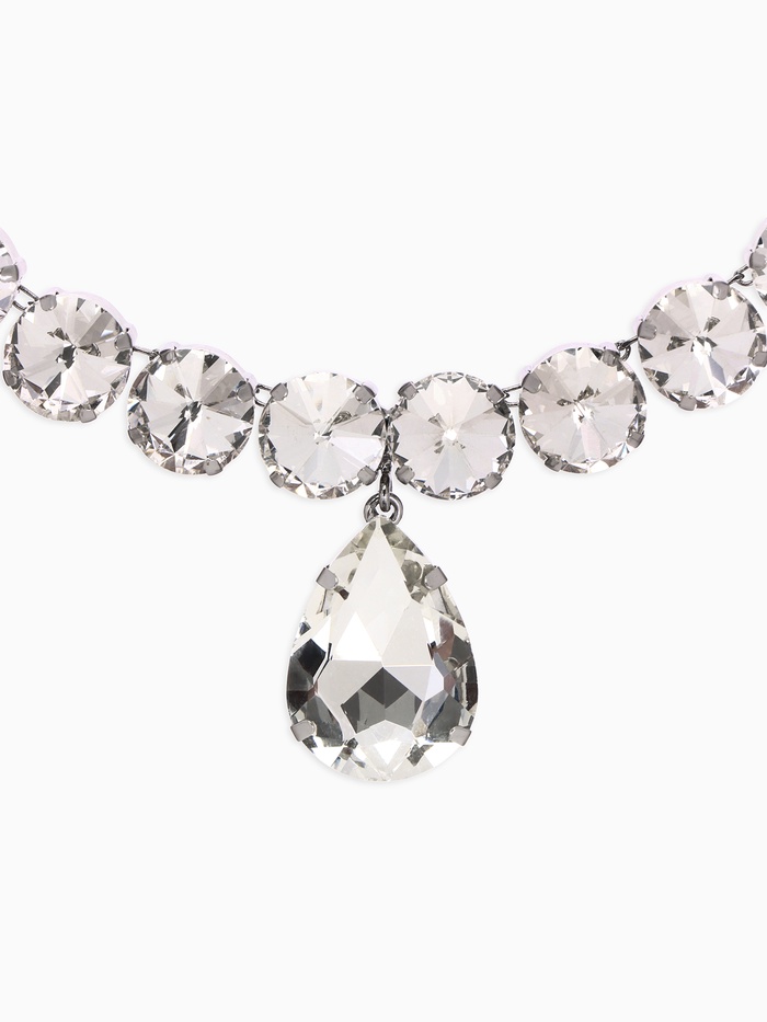 Колье выполнено в благородном белом цвете с использованием высококлассного металла, покрытого серебряным напылением. Центральной фигурой украшения является крупная каплевидная бусина, подчёркивающая грацию и нежность обладательницы. Металлические элементы колье украшены тонкой резьбой, придающей изделию винтажный шарм и подчёркивающей его оригинальность.