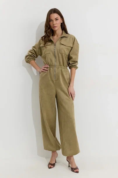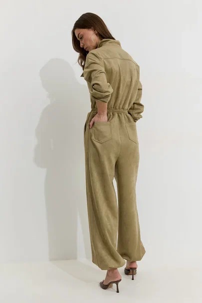 Комбинезон полуприлегающего силуэта с расширенными книзу брюками из трикотажного полотна “замша”. Горловина-стойка, по центру застежка на молнию. Рукав со спущенной линией плеча, по низу эластичная тесьма(резинка). По переду и спинке в районе талии притачной пояс, в пояс вставлена эластичная тесьма(резинка). По переду накладные карманы с клапанами. Брюки прямого силуэта, по переду и спинке карманы. По низу брюк предусмотрена кулиса с завязкой для регулирования степени прилегания. Обращаем ваше внимание, что фурнитура может отличаться от фото.