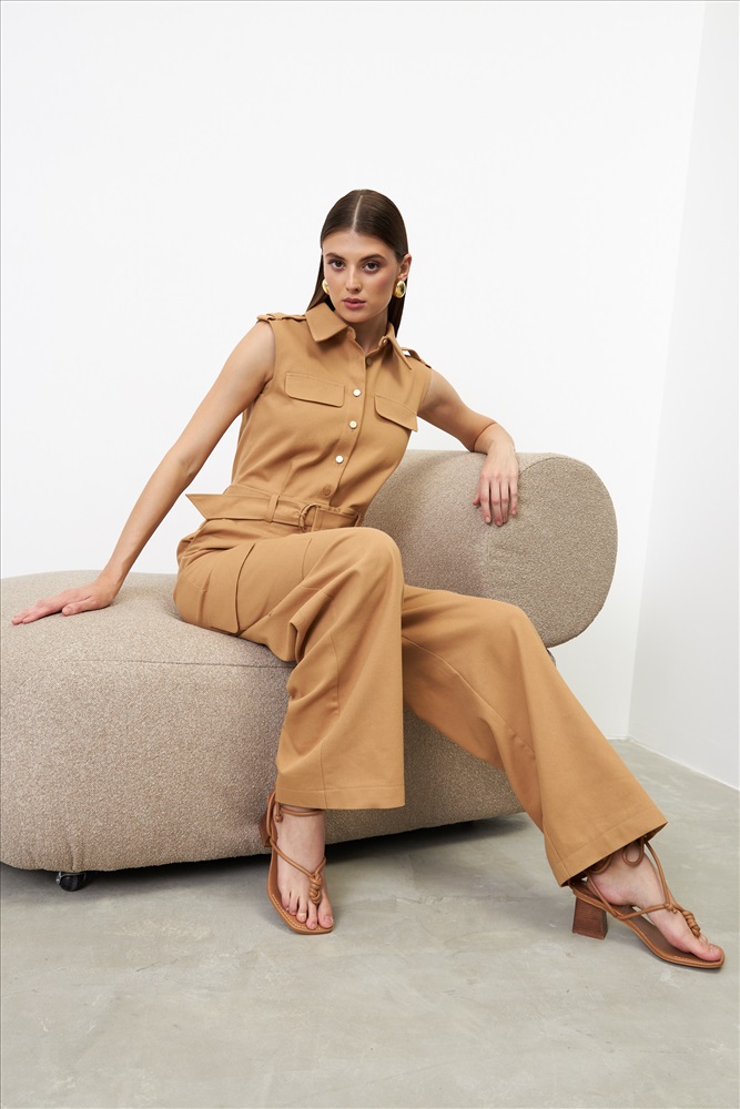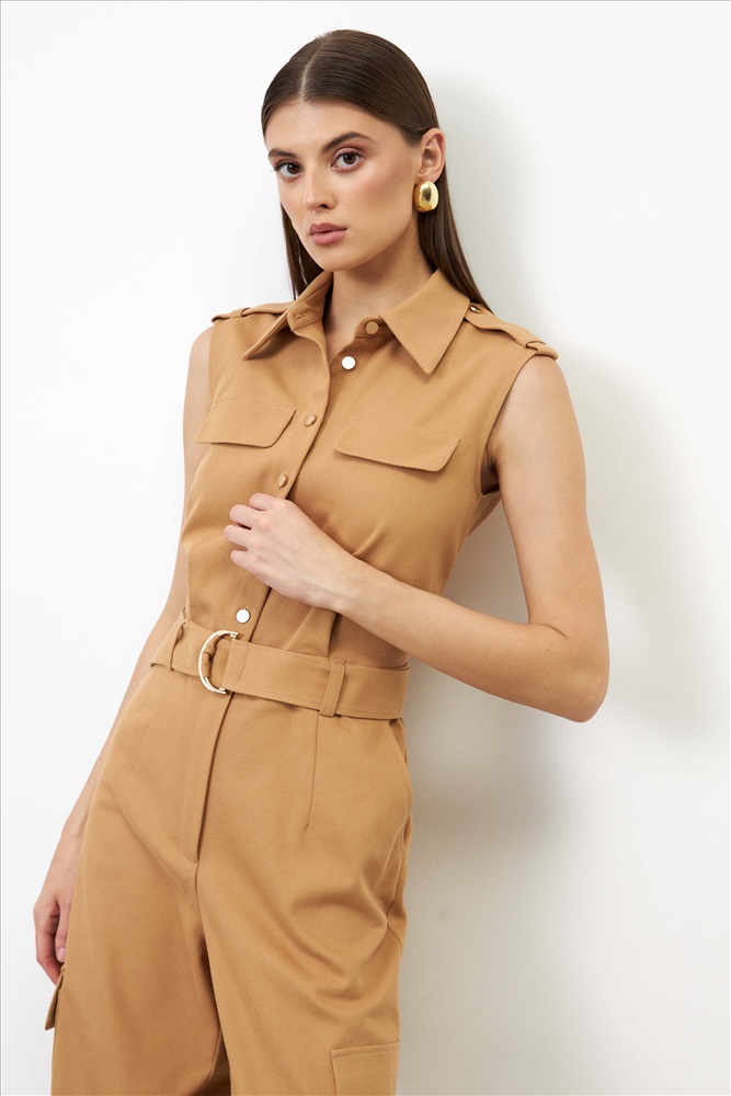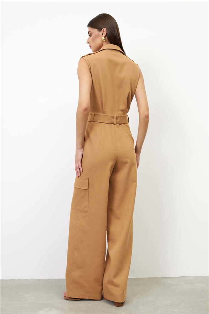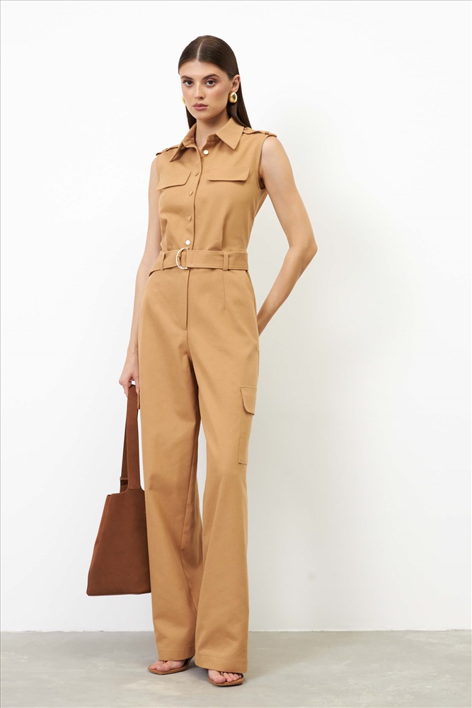 Комфортный комбинезон из джинсового полотна. Модель свободного силуэта с брюками-карго. По переду накладные клапана, застёжка на петли и металлические пуговицы. Воротник отложной со стойкой, на плечах паты с пуговицей. Линия талии с поясом на металлическую пряжку со шлёвками.