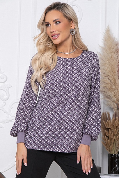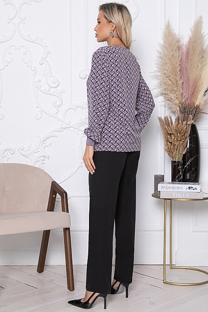 • Комплект состоящий  из блузки и брюк. Блузка свободного силуэта  из текстильного полотна, низ рукавов с манжетами из трикотажной рибаны.Брюки из костюмной ткани с высокой посадкой, зауженные к низу, по поясу эластичная резина .В среднем шве  переда имитация гульфика. По бокам  функциональные карманы. Заутюженные  стрелки придают стройность фигуре.