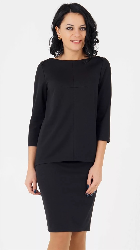 Материал: Трикотаж плотный Тип: Повседневная Сезон: Круглый год Цвет модели: Черный Страна производства: Россия Комплект блуза и юбка. Блуза из плотного трикотажного полотна. Вырез горловины "лодочка". Вытачка по груди. Рукав прямой 3/4, длина 44 см. Низ прямой. Без застёжки. Без подклада. ДИ в 42-44 р. Полка 55 см , спинка 61 см; в 46-48 р полка 58 см, спинка 64 см; в 50-54 р полка 62 см, спинка 68 см. Юбка карандаш из плотного трикотажного полотна. Пояс на широкой резине. Разрез юбки декорирован молнией под золото. Без подклада. ДИ в 42-48 р 54 см., в 50-54 р 57 см. Рост модели 164 см. , изделие 42 размера. Комментарии к товару