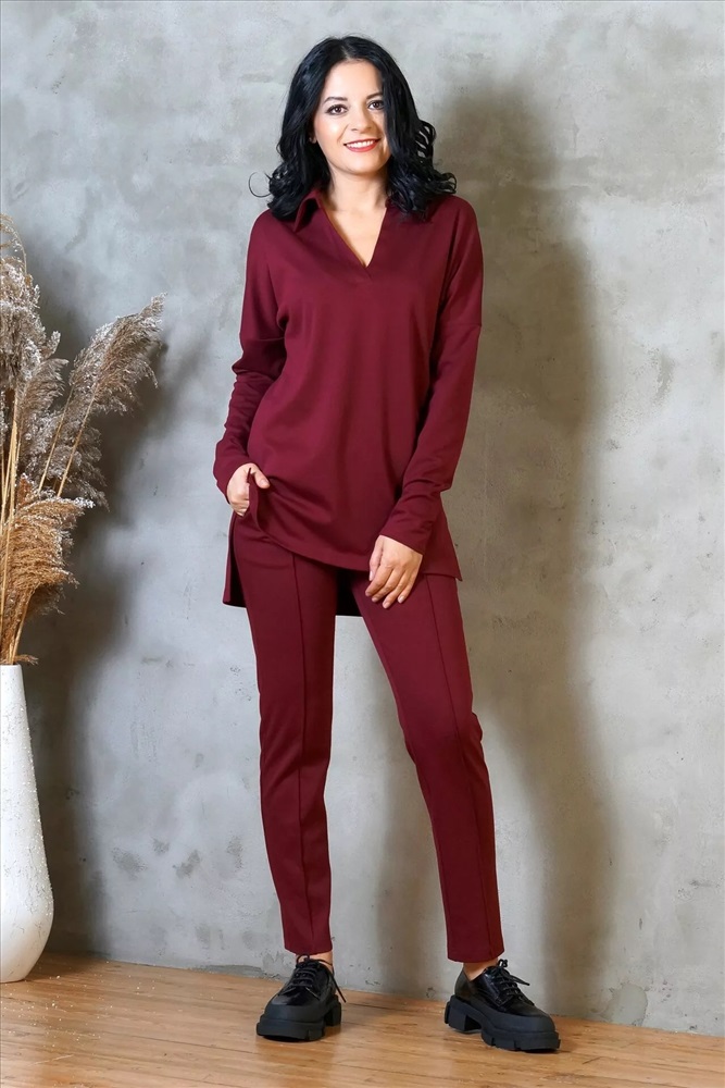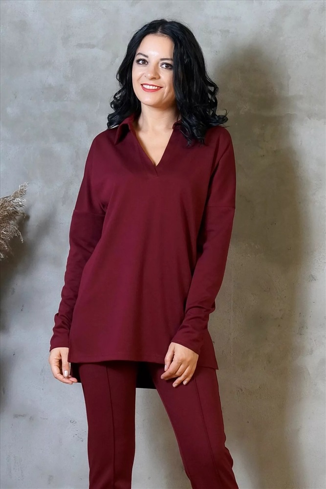 Материал: Трикотаж Тип: Повседневная Сезон: Осень-Зима Цвет модели: Марсала Страна производства: Россия Комплект блуза и брюки. Свободная блуза. Выполнена из трикотажного полотна. Расцветка марсала. Отложной воротник. Рукава длинные. Низ ассиметричный прямой с разрезами. Без застёжки. ДИ в 42-44 р перед 73 см спинка 78 см, в 46-48 р перед 74 см спинка 79 см, в 50-54 р перед 78 спинка 84 см. Брюки прямого кроя из трикотажного полотна. Расцветка марсала. Пояс на широкой резинке, резина в внутри пояса. С карманами. По переду застрочка. ДИ в 42-54 р 97 см. Рост модели 164 см. , изделие 42 размера. Комментарии к товару