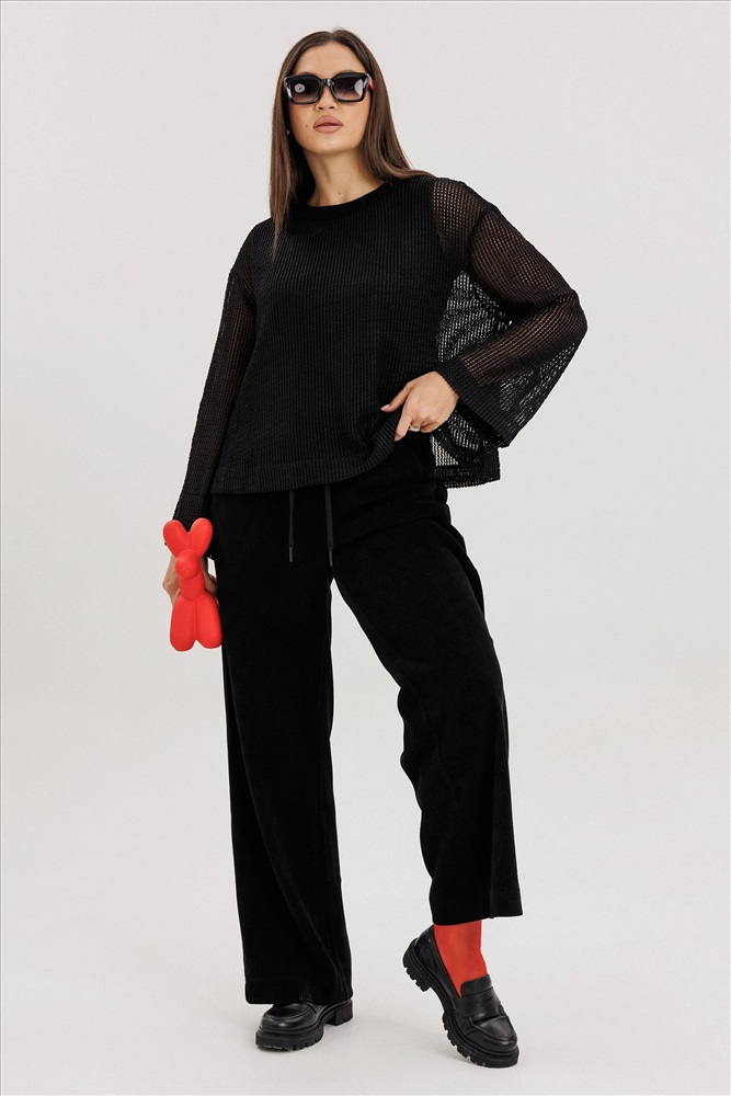 Тренд на готовый костюм с брюками - идеальное решение для тех, кто не хочет отказываться от мягкости и уюта трикотажного полотна, а также сохраняет своё время. Такой комплект создаёт максимально тёплый, элегантный и одновременно стильный образ. Брюки свободные, в расслабленном стиле, на притачном эластичном поясе с люверсами и отделочным шнуром-кулисой. По боковым швам - наклонные карманы. Джемпер свободного силуэта, покроя с заниженной линией плеча. Рукав слегка расширенный к низу. Обтачка горловины из отделочного текстурного трикотажа. Современный и стильный кроп-топ подчеркнет вашу модную натуру, создавая актуальный образ. Декоративная строчка добавляет изысканности и оригинальности, делая его уникальным. Длина джемпера около 60 см. Длина рукава с плечом около 76 см.