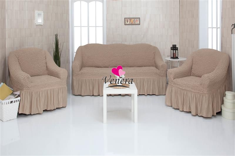 Комплект чехлов на трехместный диван и 2 кресла с оборкой капучино 211, Характеристики