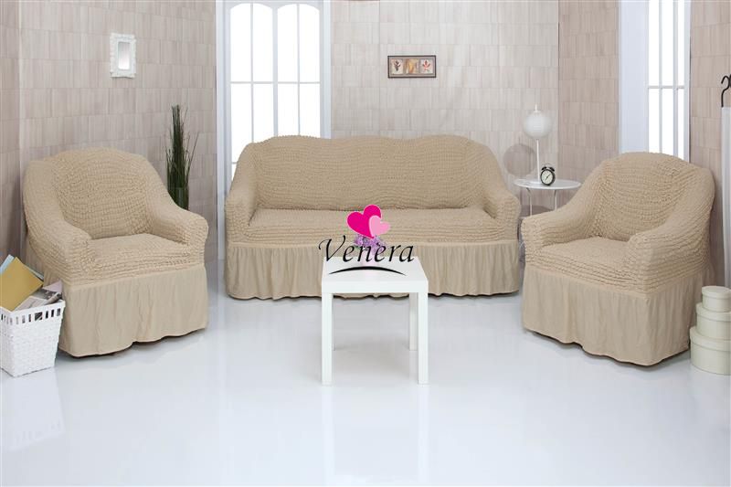 Комплект чехлов на трехместный диван и 2 кресла с оборкой светло бежевый 212, Характеристики