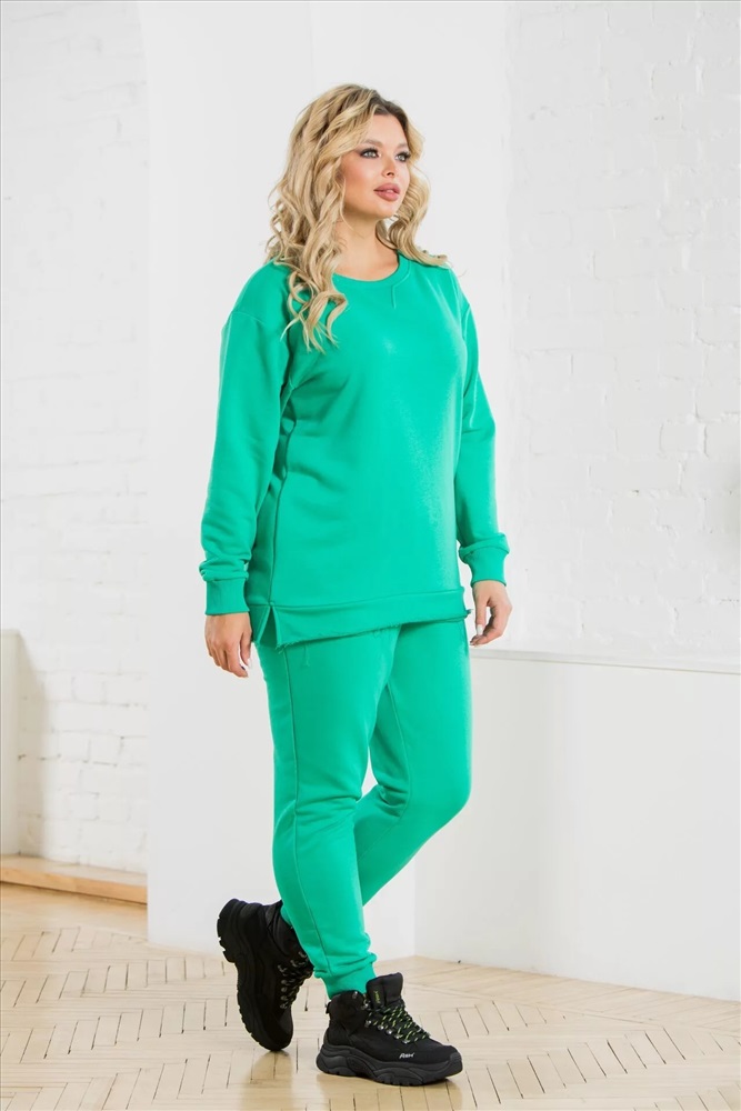 Комплект свитшот и брюки. Свитшот выполнен из трикотажного полотна футер 3-х нитка. Расцветка зеленое яблоко. Округлый вырез горловины. Длина рукава от шейной точки 73 см. Низ прямой с боковыми разрезами. Без подклада. Без застёжки. Прекрасно подойдет для повседневной носки и занятия спортом. Рекомендуемая стирка при t не более 30. ДИ в 48 р 71 см, 50-56 р 75 см, в 58- 60 р 76 см, в 62-64 р 77 см.
