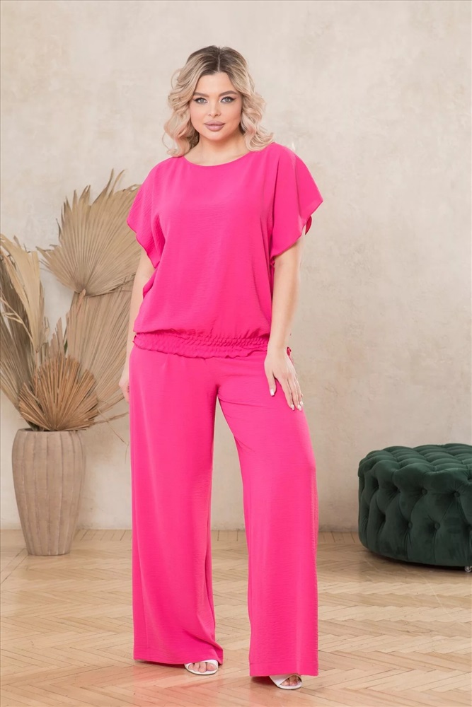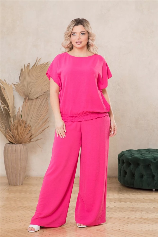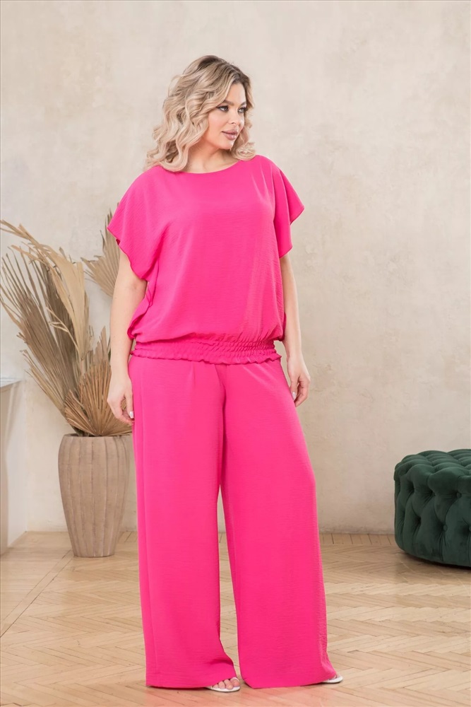 Модель изделия: Свободный силуэт Материал: Турецкий шифон Тип: Повседневная Сезон: Весна-Лето Цвет модели: фуксия Параметры модели: 105-87-116 Страна производства: Россия Комплект блуза и брюки. Блуза свободного силуэта. Вырез горловины лодочка. Выполнены из эластичной плательной ткани турецкого плотного шифона. Расцветка фуксия. Низ на сборке из шляпной резины. Края на закрутке. Без подклада. Без застёжки. Прекрасно подойдет для прогулок в жаркие дни и для повседневной носки. ДИ в 48-50 р 67 см, в 52-54 р 68 см, 56-58 р 69 см, 60-62 р 70 см. Стильные брюки, модель трубы. Выполнены из эластичной плательной ткани турецкого плотного шифона. Пояс на широкой резинке. Клёш от бедра. С карманами. Прекрасно подойдет для летних прогулок и для повседневной носки. Рекомендуемая стирка при t не более 30. ДИ в 48-64 р 116 см. Рост модели 168 см., размер модели 54 р.