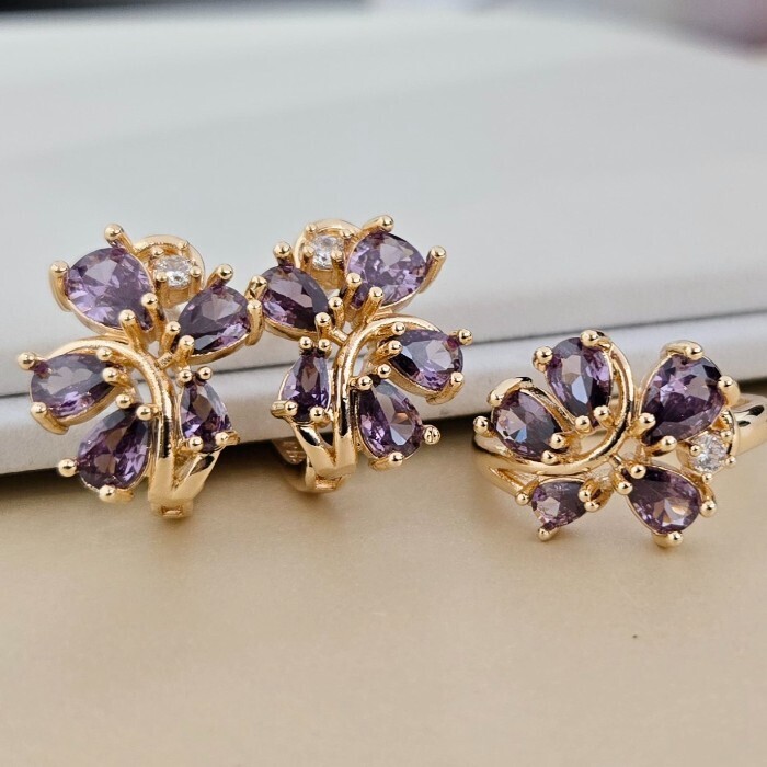 Комплект ювелирной бижутерии коллекция "Дубай" серьги и кольцо 20 р, покрытие позолота, вставка: фианиты, цвет: фиолетовый, арт.414.594-20