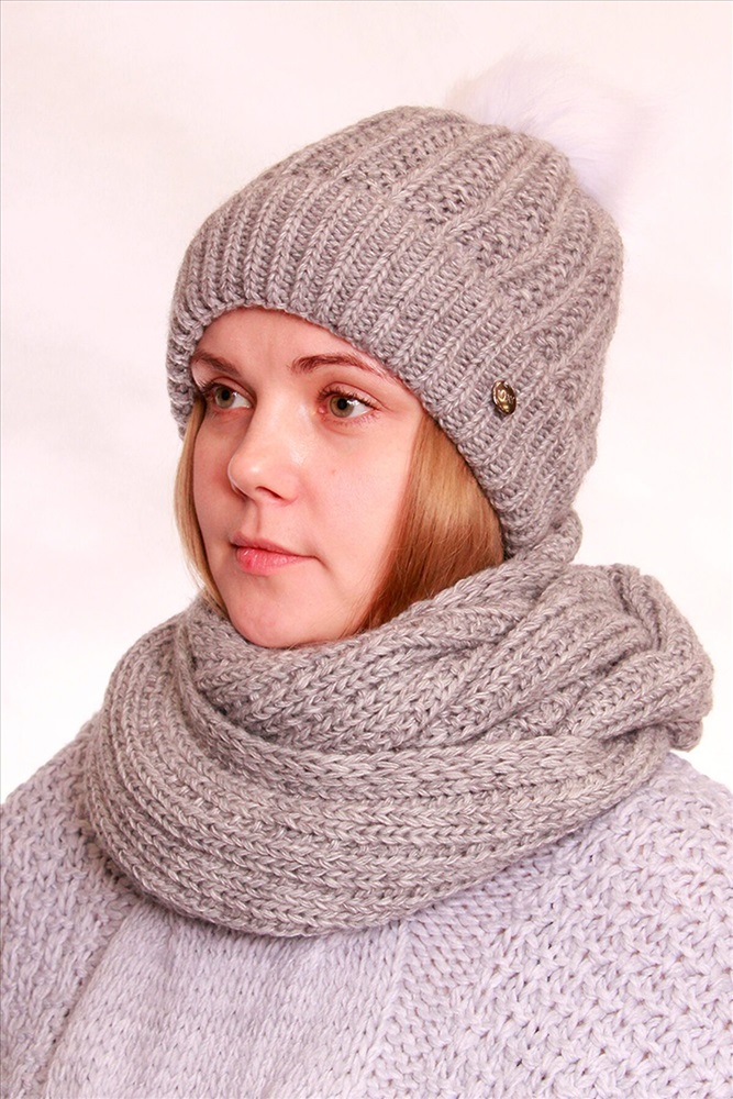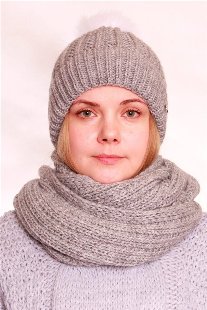 Комплект, состоящий из шапки с помпоном и снуда для женщин.