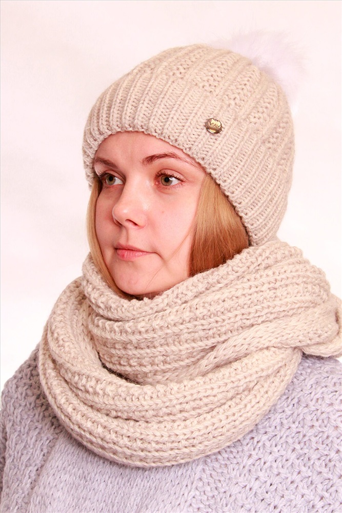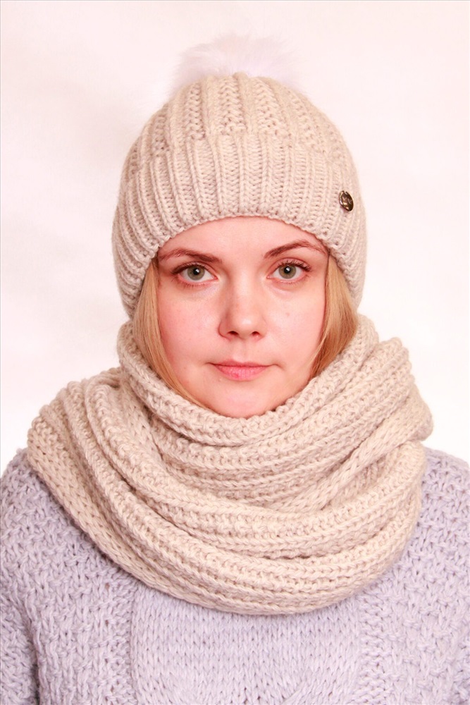 Комплект, состоящий из шапки с помпоном и снуда для женщин.