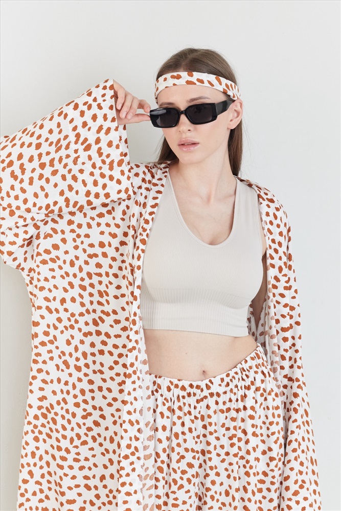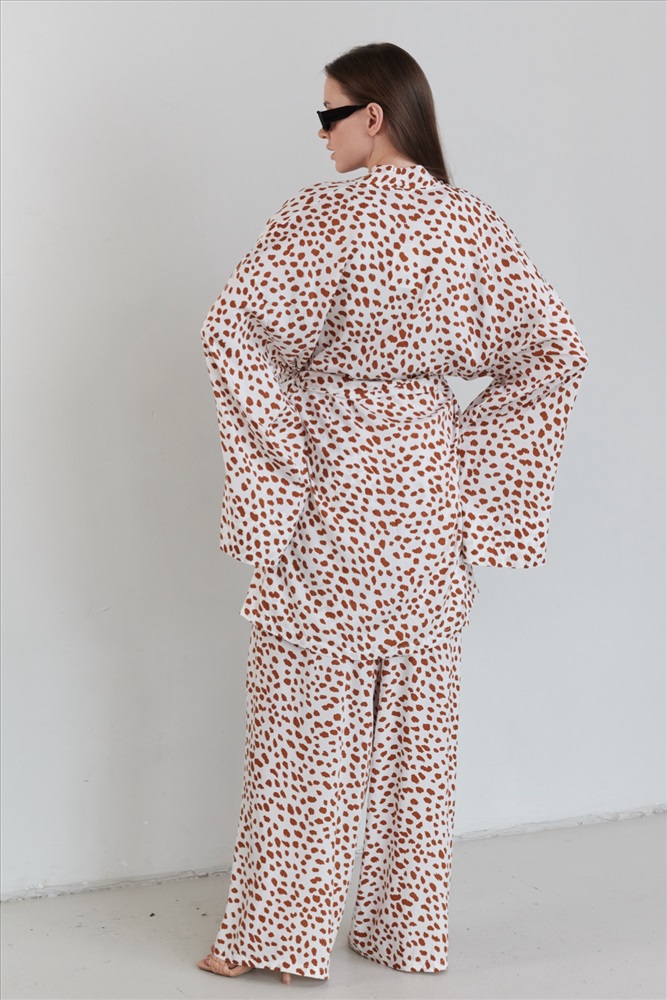 Все изделия имеют безупречный пошив и идеальную посадку. Костюм кимоно с поясом и широкими брюками из 100% вискозы. Свободный крой кимоно и брюк не стесняет ваши движения, брюки с карманами (высокая посадка, на мягкой резинке, ручной работы) не давят и подходят беременным. Костюм идеально садится на любой тип фигуры. Все изделия уникальны и отшиваются небольшими партиями. Стирка изделий вручную либо использовать машинную стирку в деликатном режиме (не более 30 градусов).