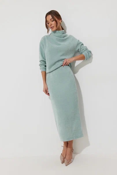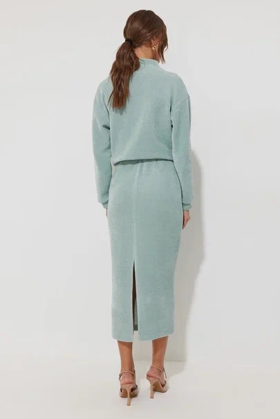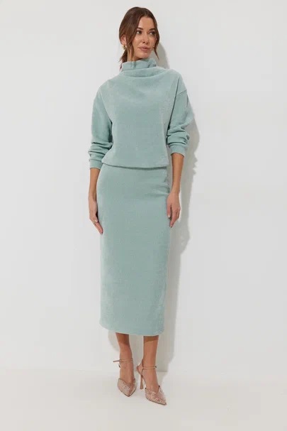 Джемпер из трикотажного полотна, прямого, слегка расширенного силуэта, со спущенной линией плеча. По горловине цельнокроеная стойка. На стойке и плече две складки. Рукав длинный с манжетой. По низу джемпера пояс.