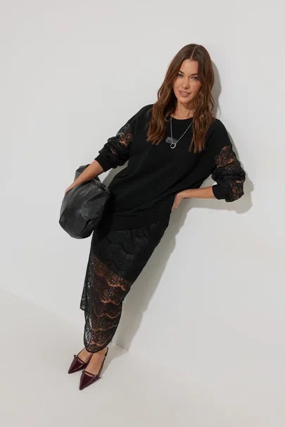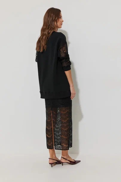 Джемпер из трикотажного полотна, свободного кроя, удлиненный, со спущенной линией плеча. С круглым вырезом горловины, с планкой из кашкорсе. С изнаночной стороны по спинке на горловине настрочена декоративная тесьма. По переду декор в виде нашивки. Обращаем Ваше внимание, что декор может незначительно отличаться от фото. Рукав выполнен из кружевной ткани, по низу рукава манжета из кашкорсе. Джемпер с поясом из кашкорсе.