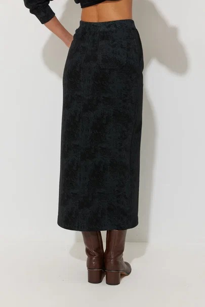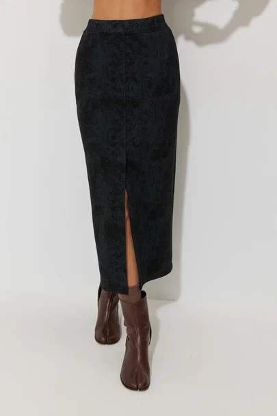 Юбка полуприлегающего силуэта из трикотажного полотна. По верху юбки притачной пояс с резинкой. По переду средний шов со шлицей и карманы. На заднем полотнище юбки накладные карманы.