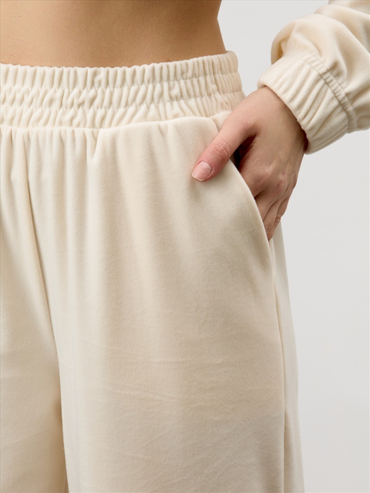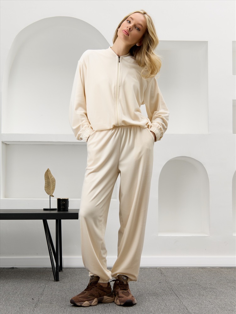 Костюм молодежный из гладкокрашенного полотна «велюр-стрейч», Куртка-бомбер прямого силуэта, свободная, с длинными втачными рукавами, горловиной овальной формы, обработанной втачной планкой, центральной бортовой застежкой на тесьму «молния». Низ изделия и нижние срезы рукавов обработаны подгибкой с вложением широкой эластичной тесьмы.Брюки – длинные, с карманами в боковых швах, на притачном поясе с эластичной тесьмой внутри. Нижние срезы обработаны подгибкой с вложением эластичной тесьмы.