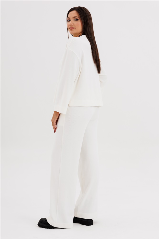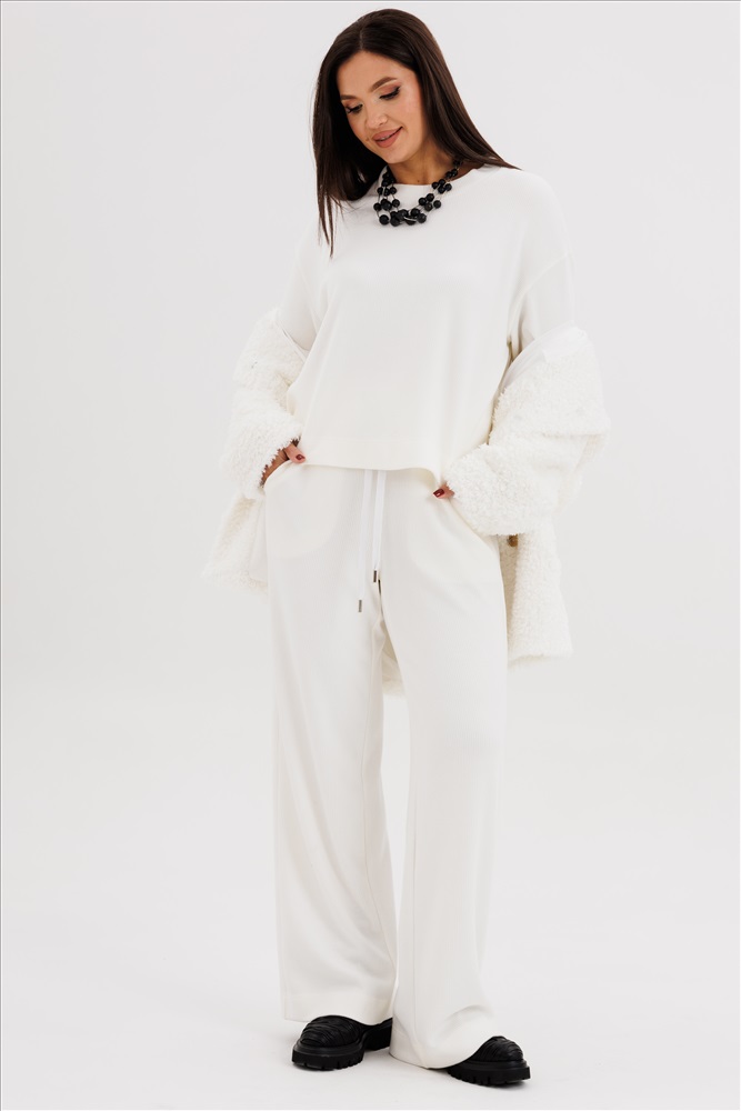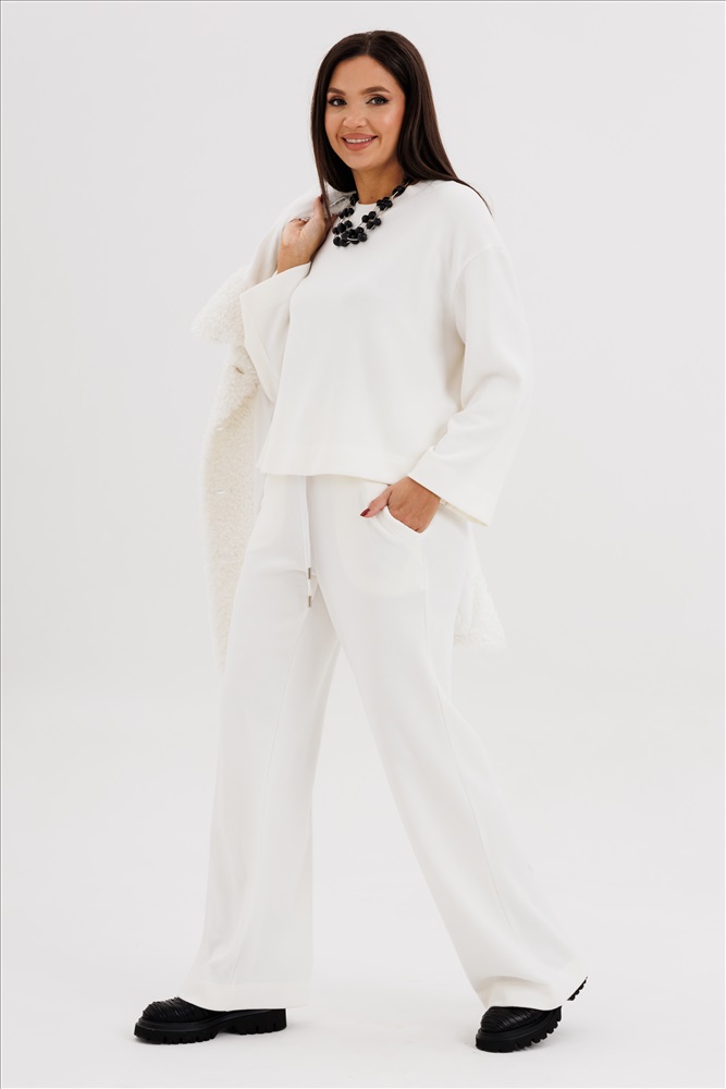 Такой вариант неформального костюма можно отметить отдельно-это настоящий шик, который в любой обстановке смотрится по-особенному. Невероятное ощущение расслабленности и комфорта обеспечивает удобный покрой и тактильно уютный трикотаж с эффектом вельвета. Брюки свободного кроя, прямые, с наклонными боковыми карманами , на эластичном поясе с люверсами и отделочным шнуром. Джемпер рубашечного покроя, свободный, слегка укороченный. Горловина круглая с притачной обтачкой. Рукав рубашечный расширенный к низу. пэ 90%, вискоза 6%, спандекс 4% Комментарии к товару