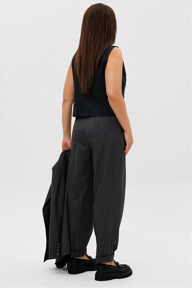 Брюки современного кроя, свободные вверху и зауженные к низу на притачном поясе со шлевками, эластичном в области спинки. Передние половинки брюк с наклонным боковым карманом и большой односторонней складкой, визуально преобразующей прямую полоску в наклонную от центра передних половинок к боковому шву. Задние половинки брюк с талиевыми вытачками. По низу брюк-цельнокроеный манжет.