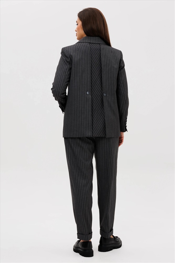 Жакет свободного упрямленного силуэта, втачного покроя, со смещенной застежкой и классическим английским воротником. Полочка с нагрудной вытачкой от линии лацкана, меняющей направление полоски в верхней части, прорезным карманом с рамкой и клапаном.