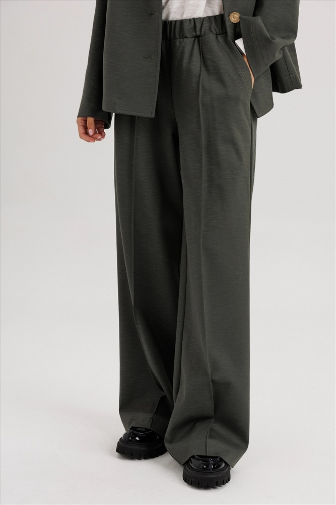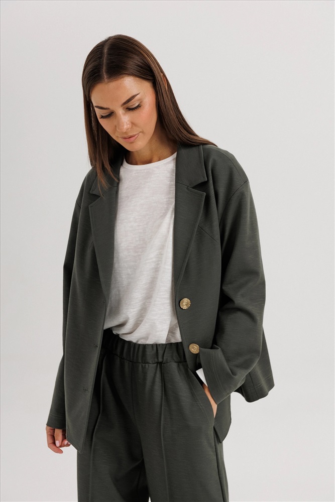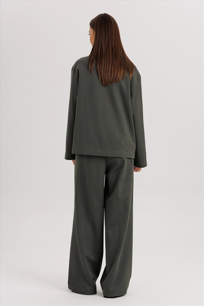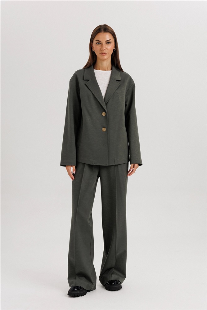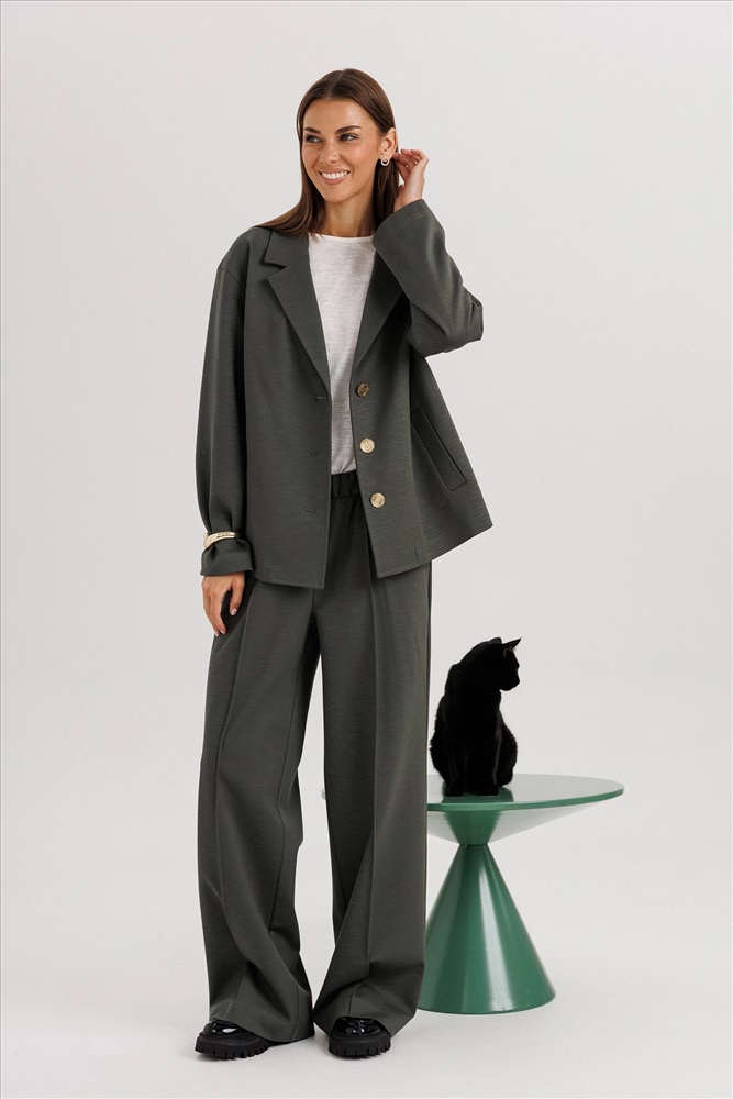 Элегантный женский брючный костюм свободного кроя — стильное решение для современных девушек, ценящих комфорт и универсальность. Классический дизайн и лаконичный силуэт делают его отличным выбором как для офиса, так и для повседневных выходов. Жакет: Свободный прямой крой, длина до линии бедер. Классический английский воротник с лацканами. Застежка на две крупные пуговицы. Длинные прямые рукава. Минималистичный дизайн без нагромождения деталей. Брюки: Свободные, прямые, с расширением к низу. Посадка средняя, комфортная линия талии. Длина удлиненная, прикрывает обувь. Стрелки спереди визуально вытягивают силуэт. Особенности: Лаконичный дизайн, который легко сочетается с базовыми футболками, блузами и обувью. Подходит как для делового стиля, так и для кэжуал образов. Универсальный глубокий оттенок ткани делает костюм практичным и актуальным в любое время года. Костюмная ткань (смесь полиэстера И вискозы — для комфорта и износостойкости). Уход: Ручная или деликатная стирка при 30°C. Не отбеливать. Гладить при низкой температуре. Костюм: вискоза 75%, ПЭ 25% Комментарии к товару