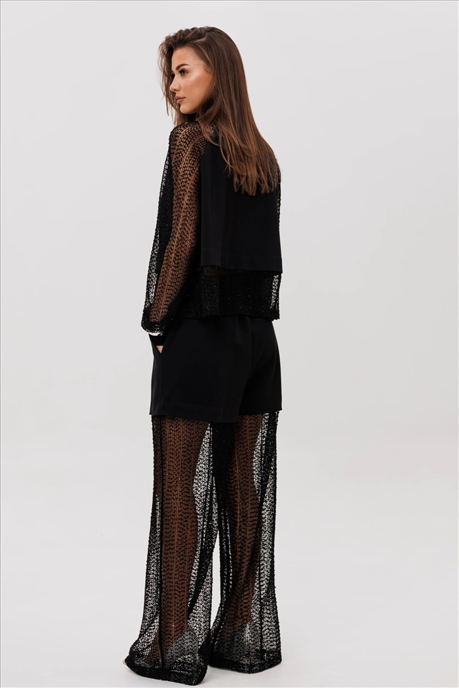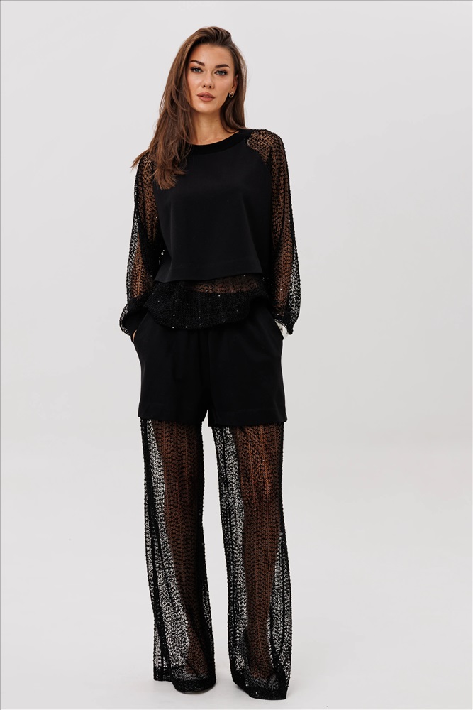 Современный брючный комплект, который создаёт эффект многослойности и лёгкого сияния. Джемпер выполнен из мягкого, комфортного вискозного полотна с нейлоном и дополнен воздушными рукавами из мерцающей сетки с россыпью микропайетки. Брюки на удобном эластичном поясе имеют прозрачную нижнюю часть в тон — подвижную, блестящую и подчёркивающую силуэт. Стильное решение для тех, кто ценит тренды и оригинальное звучание образа.