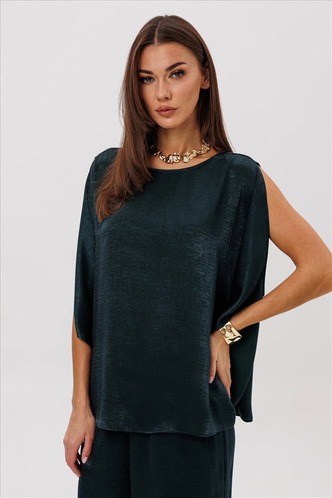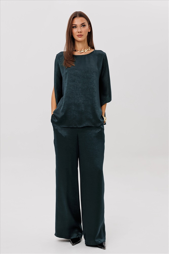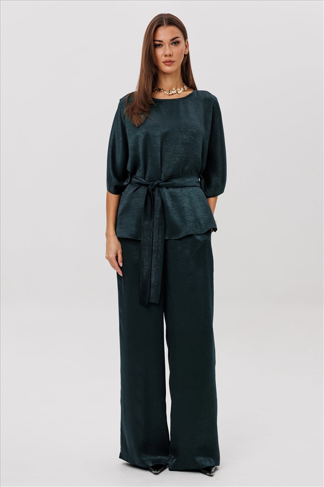 Роскошный брючный комплект из высококачественного атласа — это готовый образ для особых случаев и стильных выходов. Свободная блуза beautifully драпируется, мягко играет на свету и позволяет носить её как в расслабленном варианте, так и подчёркивая талию поясом. Широкие брюки на комфортной резинке создают эффект удлинённых ног и дарят полную свободу движений. Современная элегантность, которая всегда смотрится дорого и effortlessly chic.