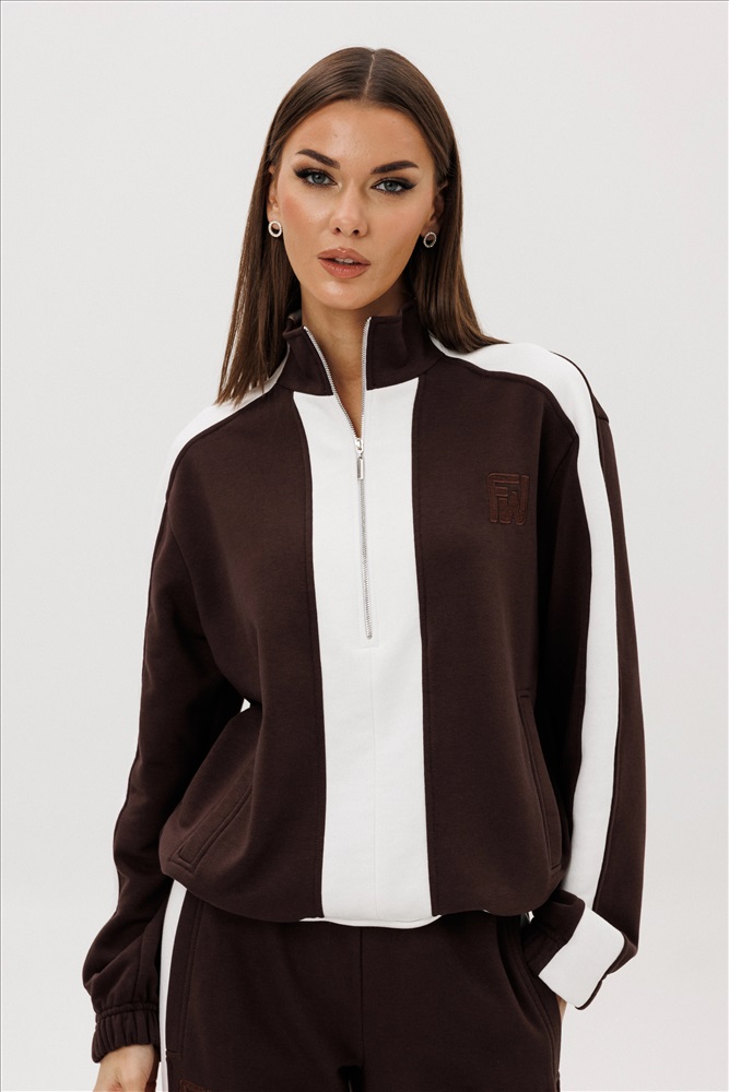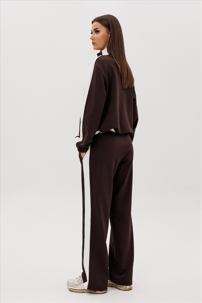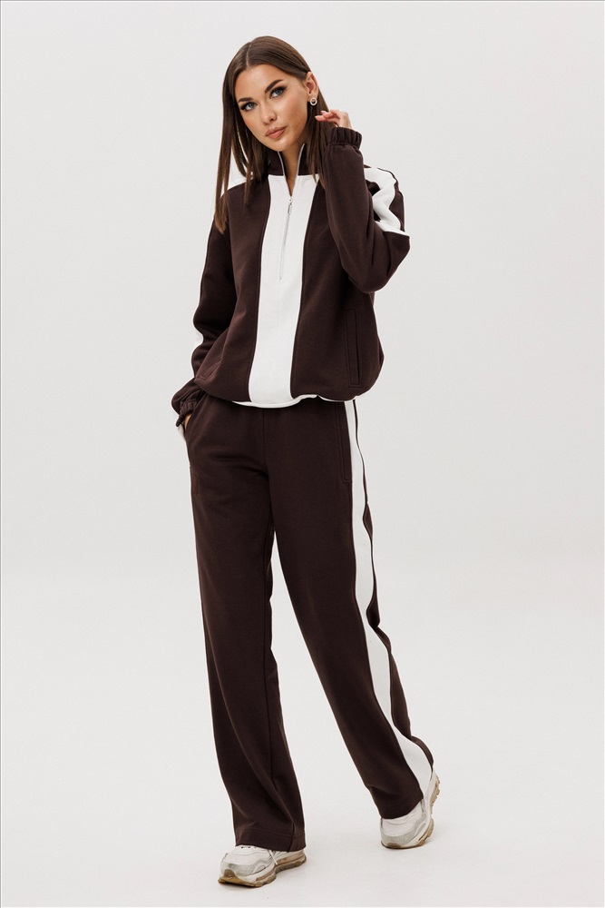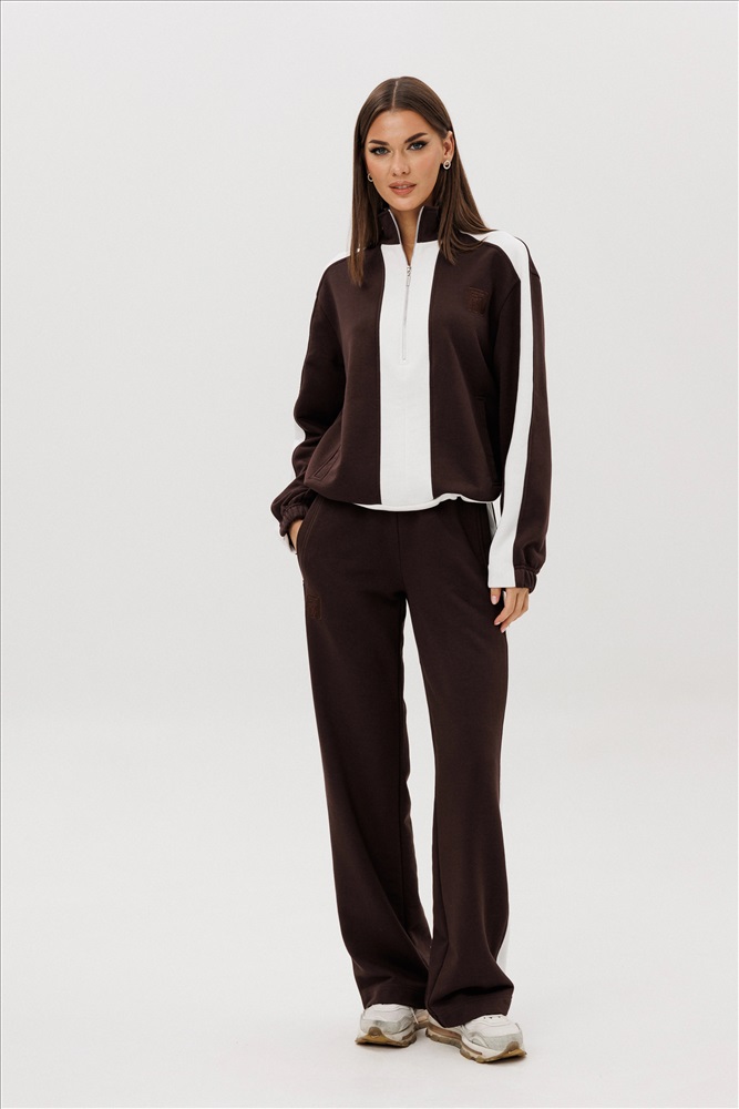 Комфорт - один из ключевых трендов современной действительности, который отлично реализуется в контексте стиля спорт-кэжуал. Его выбирает тот, кто не желает ограничивать себя жёсткими рамками, стремится выглядеть модно и динамично и не считает, что красота требует жертв. Свободный, упрямлённый свитшот с заниженной линией плеча, воротником-стойкой, частичной застёжкой на тесьму-молнию, прорезными карманами, рукавом, состоящим из 3-х частей с притачной манжетой и кулисой с регулирующей эластичной тесьмой и фиксаторами по низу изделия. Брюки свободные, прямые на притачном эластичном поясе с контрастными лампасами и карманами с листочками в боковых швах. Контрастные лампасы на брюках, рукавах, по центру переда и низу придают модели особую динамичность и изысканность.