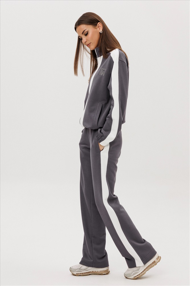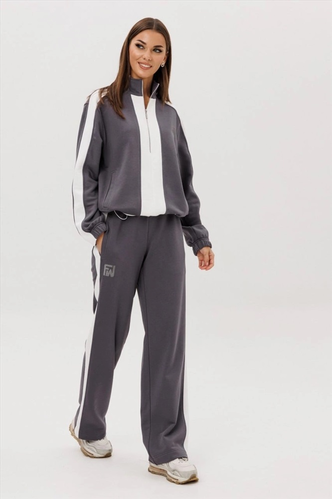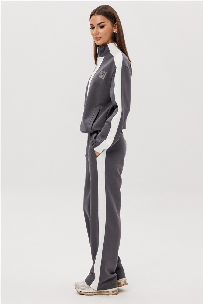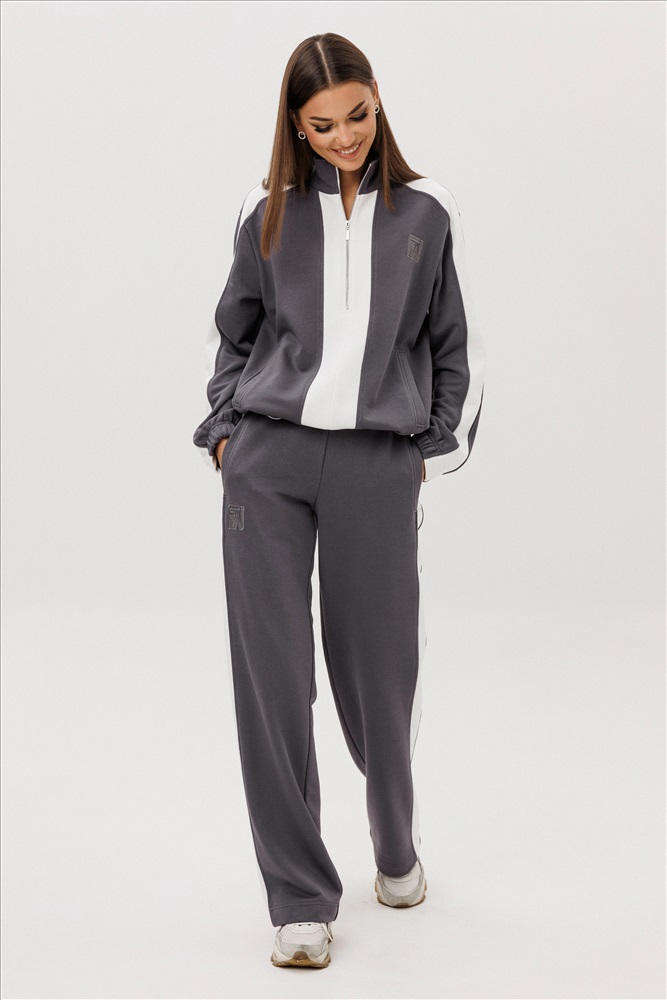 Комфорт - один из ключевых трендов современной действительности, который отлично реализуется в контексте стиля спорт-кэжуал. Его выбирает тот, кто не желает ограничивать себя жёсткими рамками, стремится выглядеть модно и динамично и не считает, что красота требует жертв. Свободный, упрямлённый свитшот с заниженной линией плеча, воротником-стойкой, частичной застёжкой на тесьму-молнию, прорезными карманами, рукавом, состоящим из 3-х частей с притачной манжетой и кулисой с регулирующей эластичной тесьмой и фиксаторами по низу изделия. Брюки свободные, прямые на притачном эластичном поясе с контрастными лампасами и карманами с листочками в боковых швах. Контрастные лампасы на брюках, рукавах, по центру переда и низу придают модели особую динамичность и изысканность.