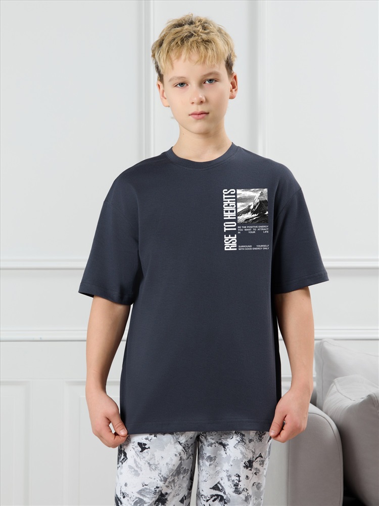 Ткань: Кулирка Кулирка - это самое гладкое и тонкое трикотажное полотно из чистого хлопка. С лицевой стороны ткань «кулирка» выглядит как «вертикальные косички», орнамент изнаночной стороны напоминает «кирпичную кладку». Свойства кулирного трикотажа- воздухопроницаемость, гигроскопичность, не теряя своей формы, практически не тянется в длину и хорошо растягивается в ширину, не образует складки. Костюм для мальчика, состоящий из футболки и брюк. Футболка однотонная с принтом на груди; модель свободная, со спущенной линией плеч, овальным вырезом горловины. Брюки из полотна с набивным рисунком эксклюзивного дизайна, прямые, с боковыми карманами с обтачными входами, на притачном поясе с отстроченной эластичной тесьмой.