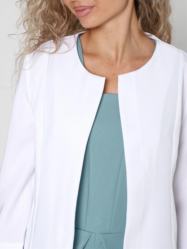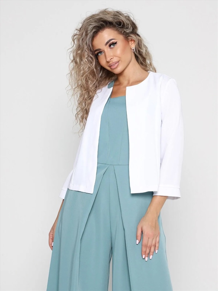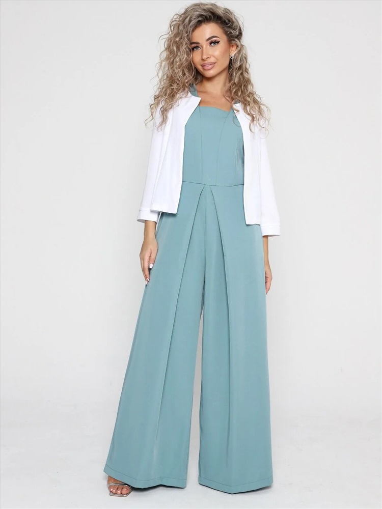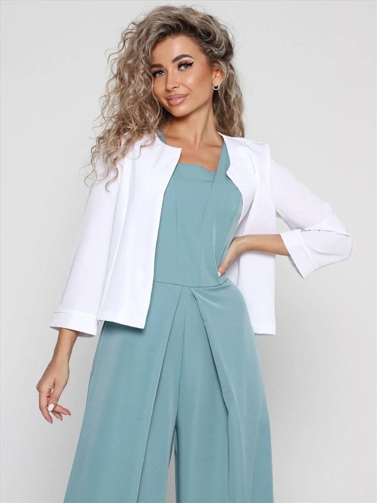 Этот костюм-двойка представляет собой сочетание белого жакета и комбинезона мятного цвета. Жакет отличается лаконичным дизайном с рукавами 3/4 длины, отсутствием пуговиц и наличием манжет. Комбинезон выполнен в стиле брюк-палаццо с вырезом каре, молнией на спине и удобными карманами, встроенными по шву. Такой комплект станет отличным выбором для создания стильного и современного образа, подходящего как для повседневной носки, так и для особых случаев.