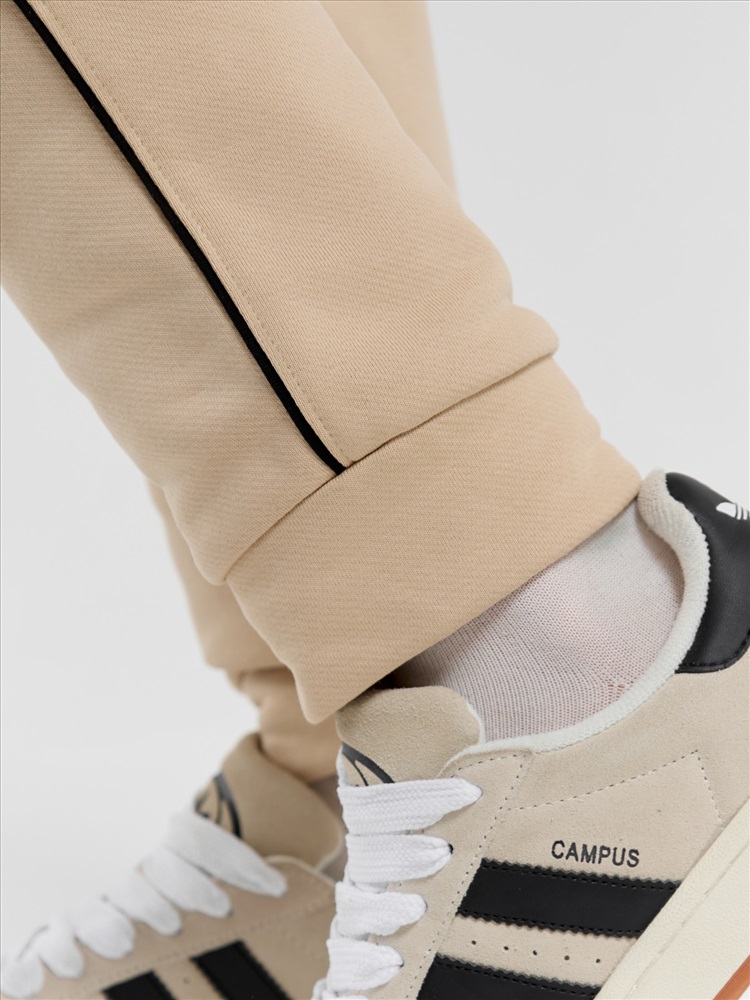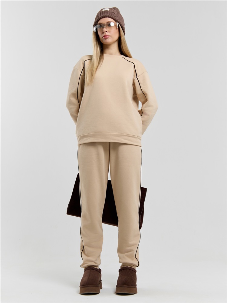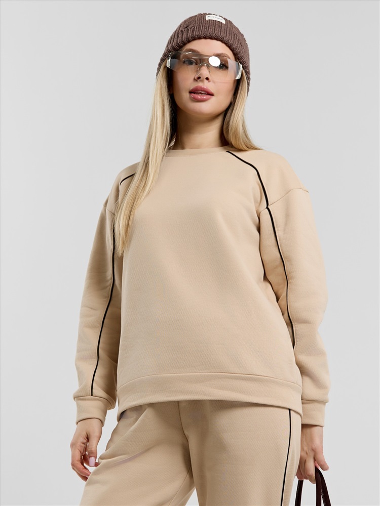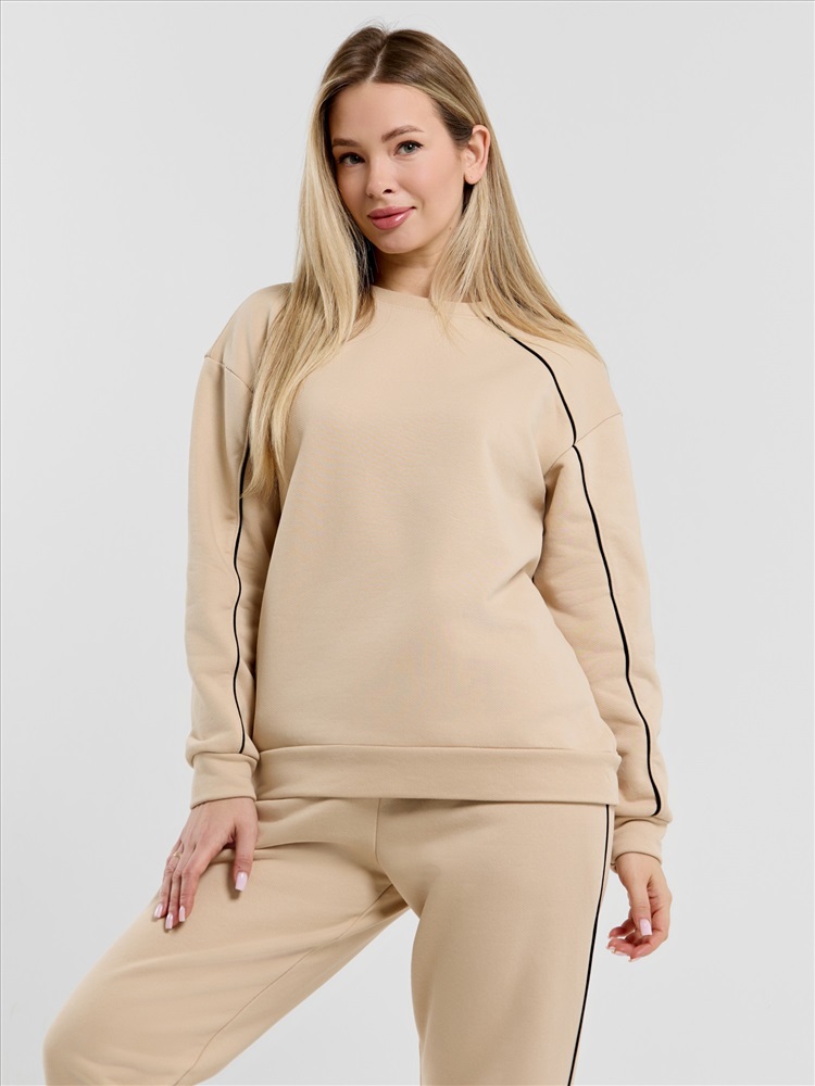 вставлен кант контрастного цвета, переходящий с полочки на рукава и образующий единую линию.Брюки – полуприлегающего силуэта, на притачном поясе с эластичной тесьмой внутри и шнурком, продетым через две петли в центре пояса. Боковые швы брюк, входы в карман- с кантом контрастного цвета в швах соединения. Нижние срезы брюк обработаны манжетами.