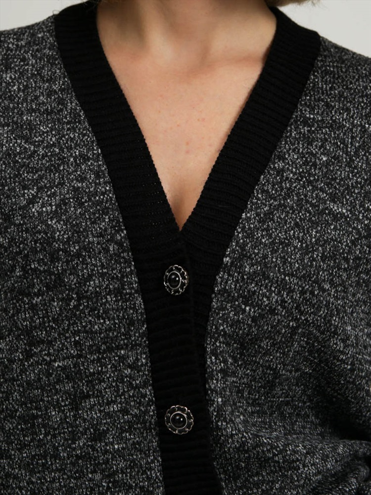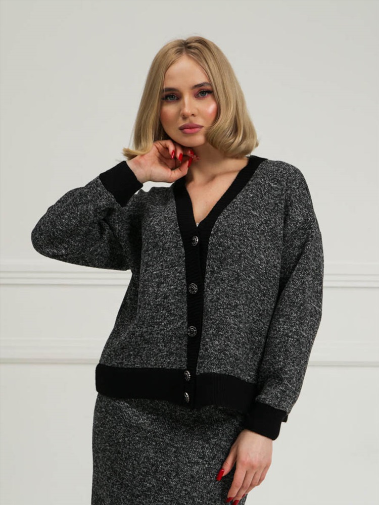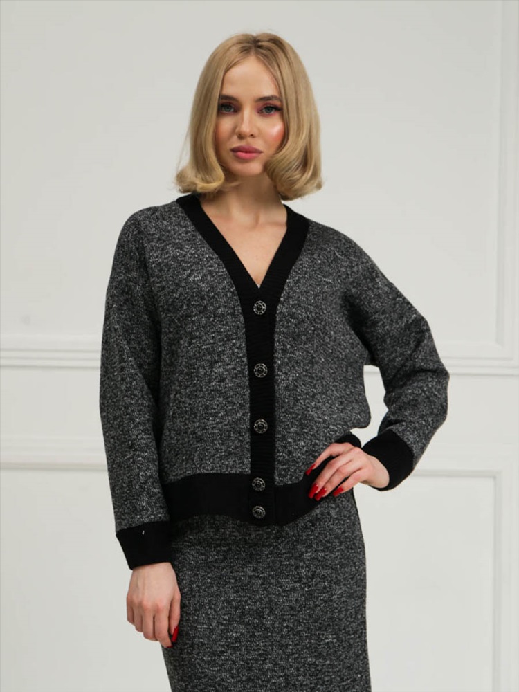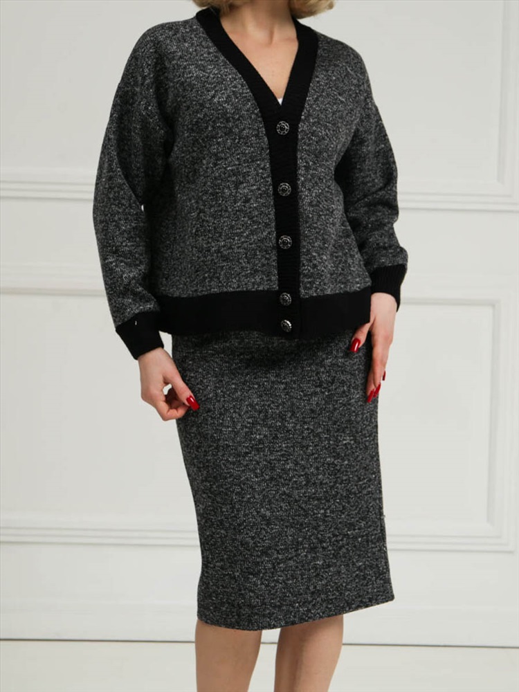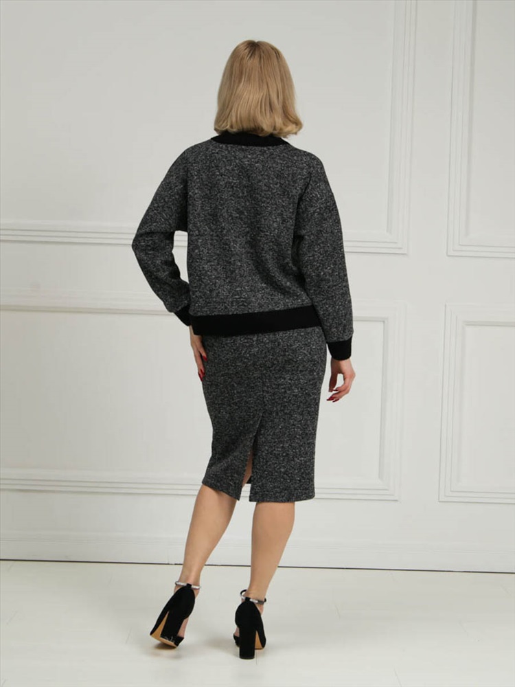 Эффектный костюм полуприлегающего силуэта из плотного трикотажного полотна серого цвета. Кардиган дополнен планкой и манжетами выполненными в технике ручного вязания. Застежка на пуговицы по планке переда. Верхняя часть юбки обработана поясом с резинкой. Длина кардигана по спинке от плечевого шва до низа изделия — 55 см.