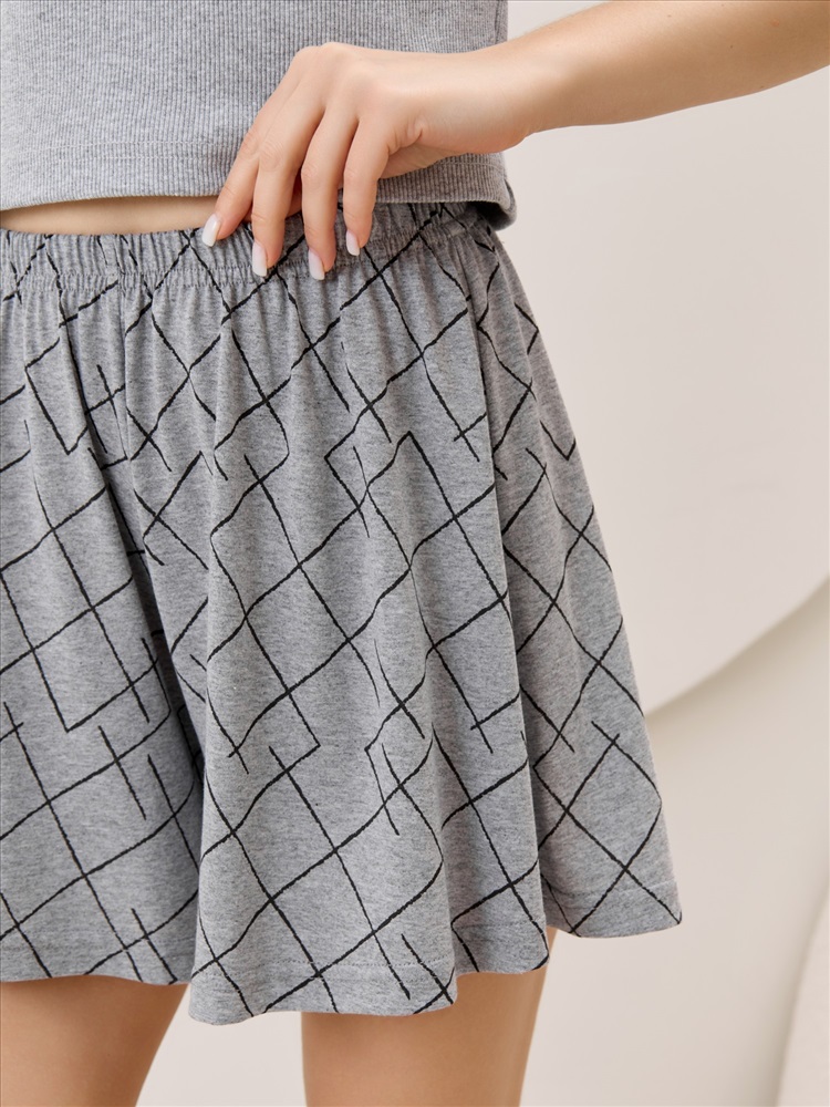 Ткань: В-Кашкорсе/Н-Кулирка Костюм молодежный из трикотажного полотна двух видов: «кашкорсе» и меланжированной «кулирки», состоящий из майки и шорт. Майка – из гладкокрашеного полотна «кашкорсе», средней длины, с горловиной овальной формы. Срезы пройм и горловина окантованы широкой окантовкой из основного материала.Шорты – из меланжированого полотна «кулирка» с набивным рисунком, средней длины, широкие, с эластичной тесьмой по талии.